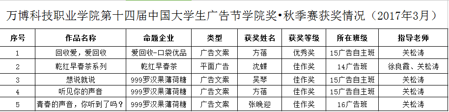 由中国广告协会主办🧳,广告人文化集团承办的第14届中国大学生广告艺术节学院奖秋季赛圆满落幕🕘,我院在此次比赛中荣获优秀奖1项,佳作奖4项。此外,艺术分院广告学教研室主任关松涛和专职教师徐良霞分别荣获第14届中国大学生广告艺术节学院奖秋季赛的优秀指导老师奖✊🏻。