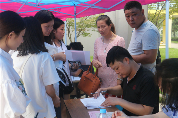 早上7点⬜️,迎新工作就进入了紧张而有序的状态,位于教学楼前广场的新生接待处,不时迎来一批批洋溢着青春笑容的2017级新生。在新生接待处,工作人员有条不紊地接待着前来报到的新生和家长,他们会心的微笑和关切的问候,让新生和家长倍感温暖。