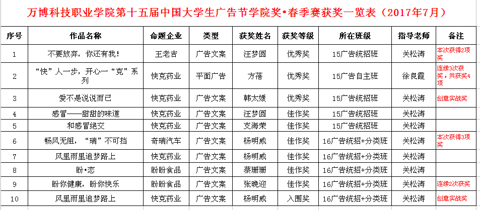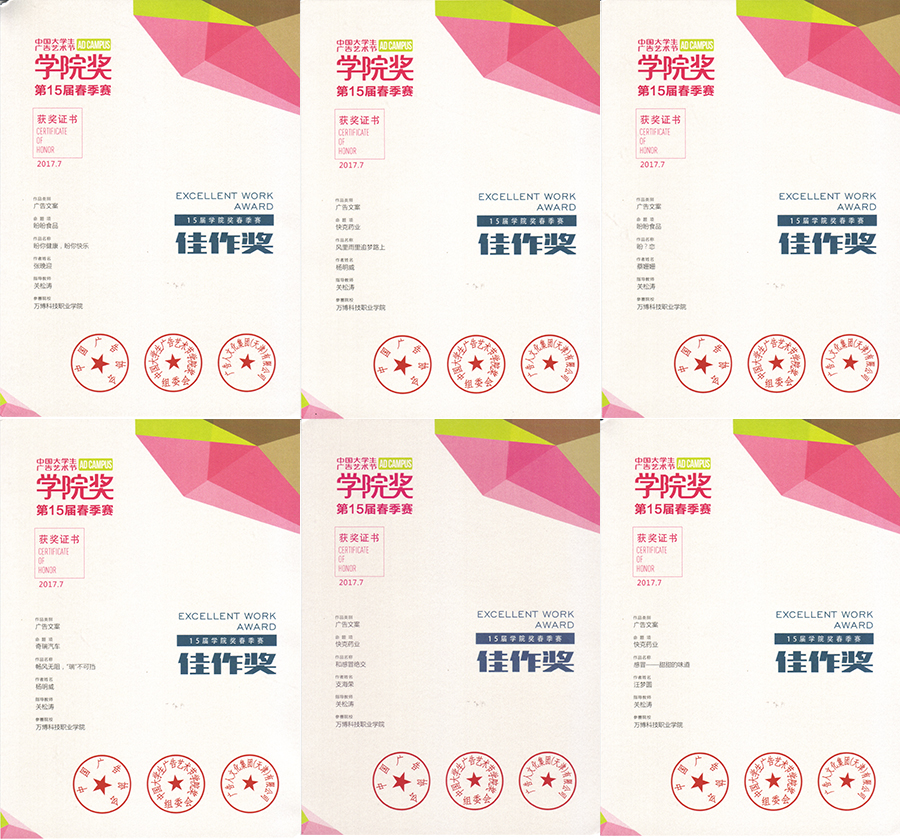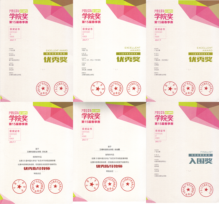 学院奖春季赛自2017年3月12日启动后,在学院各级领导的大力支持下,在广告设计与制作专业的全体教师的细心指导和无私奉献下,在同学们高涨的参赛热情和青春与创意的碰撞下,历经2个多月的时间共创作并提交了参赛作品271件🪘,达到历年来参赛提交作品最多数量。最终,我院2015级广告统招班的汪梦圆和韩太媛以及2015广告自主班的方蓓三位同学分别荣获大赛的优秀奖🫵🏽;2015级广告统招班的汪梦圆、支海荣以及2016级广告杨明威🧓🏼、蔡珊珊和张晚迎5位同学分别荣获春季赛佳作奖;2016级广告杨明威荣获创意实战入围奖1项。
