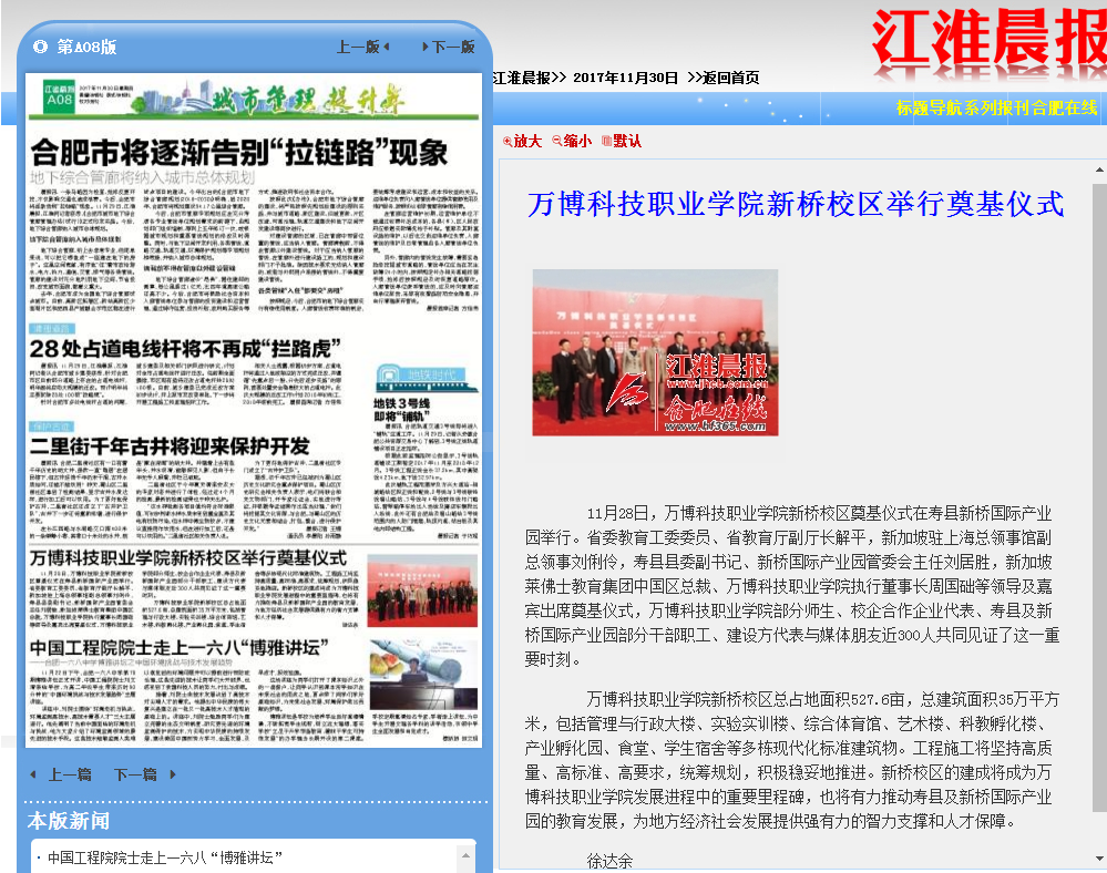 江淮晨报/合肥晚报11月30日第A08版发布题为《彩神Vll学院新桥校区举行奠基仪式》,电子版报纸地址为:http://epaper.hf365.com/jhcb/html/2017-11/30/content_354773.htm