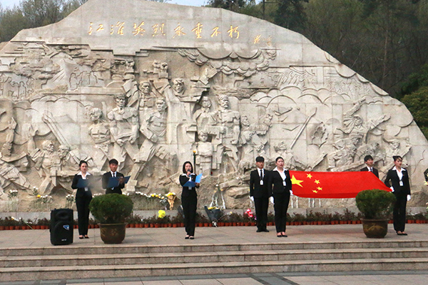 在邓小平同志题写的“江淮英雄永垂不朽”的英雄纪念碑前,同学们齐声高唱中华人民共和国国歌,迎接神圣的国旗⌛️,随后全体默哀一分钟💅🏼,并由学生代表向英雄纪念碑敬献花束以表哀思。