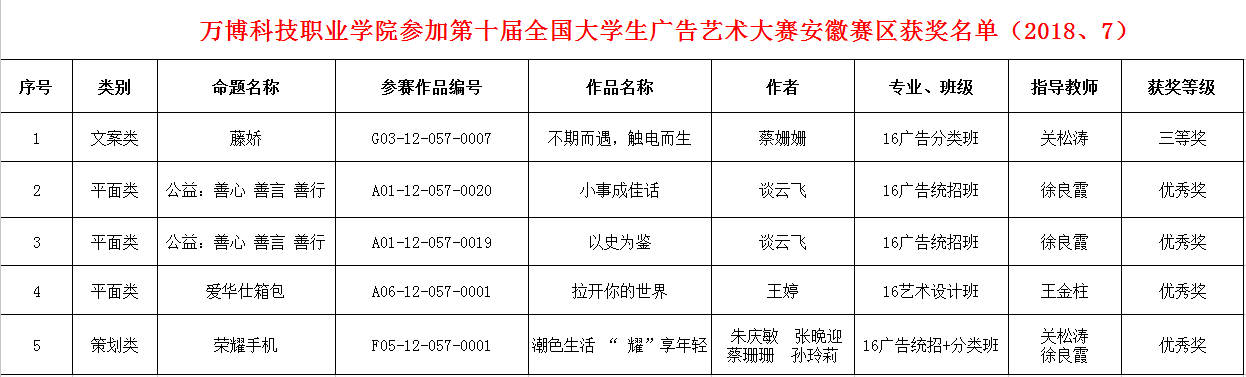 7月20日🚶🏻♂️➡️,由教育部高等教育司指导、安徽省教育厅主办、合肥工业大学承办的第十届全国大学生广告艺术大赛(简称“大广赛”)安徽分赛区评审结果公示揭晓,我院荣获三等奖1项和优秀奖4项。