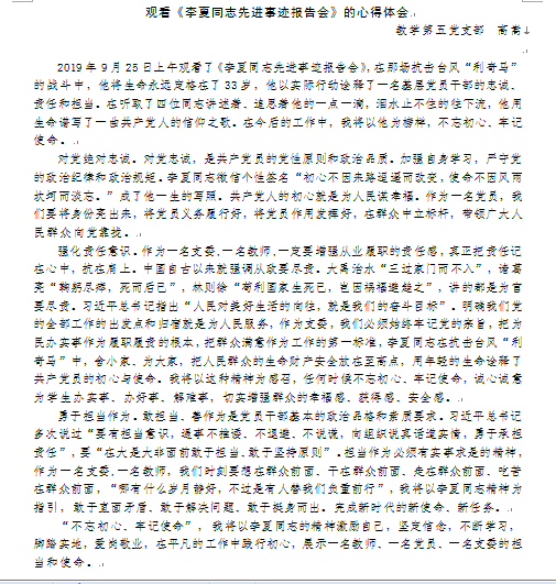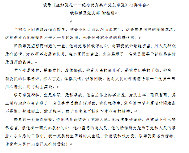 教学第五党支部积极贯彻落实校党委“不忘初心✮🫶、牢记使命”主题教育领导小组办公室和省🍓🕵🏼♂️、市委组织部关于学习李夏同志先进事迹党员教育电视片《生如夏花》的通知☀️,支部组织全体党员利用手机🙂↔️、电脑等渠道进行自学收看。