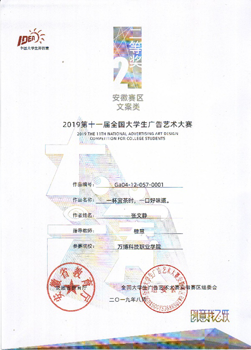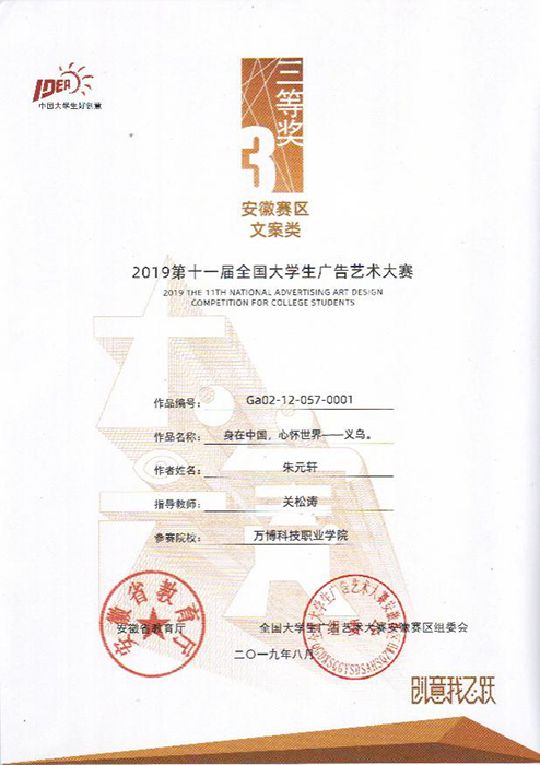 其中,由艺术传媒学院广告传媒教研室专职教师桂慧指导的两个作品——18级广告班张文静同学创作的文案类作品《一杯宜茶时,一口好味道》荣获大赛二等奖,18级广告班王婷同学创作的文案类作品《温暖的心意》荣获大赛三等奖;广告传媒教研室主任关松涛指导的两个作品——17级广告班施健同学创作的平面类作品《轻薄柔滑》荣获大赛三等奖,18级广告班朱元轩同学创作的文案类作品《身在中国,心怀世界——义乌》荣获大赛三等奖。