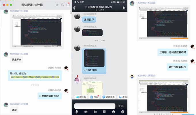 教师在语音直播授课的同时,通过QQ群与学生互动交流🧩、提问,及时了解学生对所授知识掌握情况和实践操作中的问题所在。并鼓励没有电脑的同学克服困难,通过书写代码做好手写笔记,努力完成每一项教学任务。