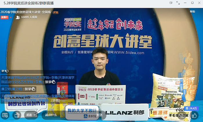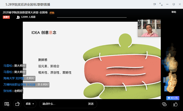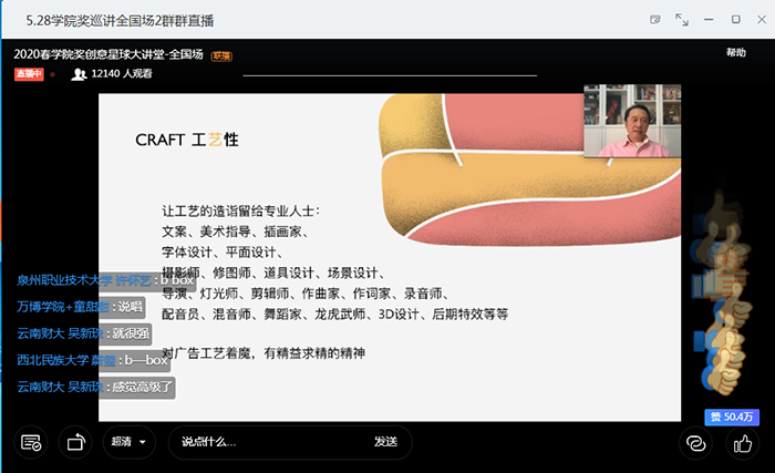 自从5月15日以来,大广节学院奖2020春季征集活动创意星球大讲堂线上巡讲活动已经为全国各区域的高校师生量身打造了20余次线上创意课🧑🏽🌾, 各命题代表登陆直播间♠︎,在线为参赛的老师同学们讲述品牌故事🔂、解析命题策略单、答疑解惑🧝🏻♂️🥫,学院奖组委会还邀请到了众多行业资深广告人🕦、大咖创意讲师、学院奖评委,来到直播间🧑🏻🦱,为同学们分享从业心得,解读优秀获奖作品,打开创意思维,同时也针对同学们在创作中遇到的问题和困惑进行解答互动,赢得了参赛师生的一致好评点赞。彩神Vll广告设计与制作专业师生也受邀参加了其中8场创意星球大讲堂🤞🏽。