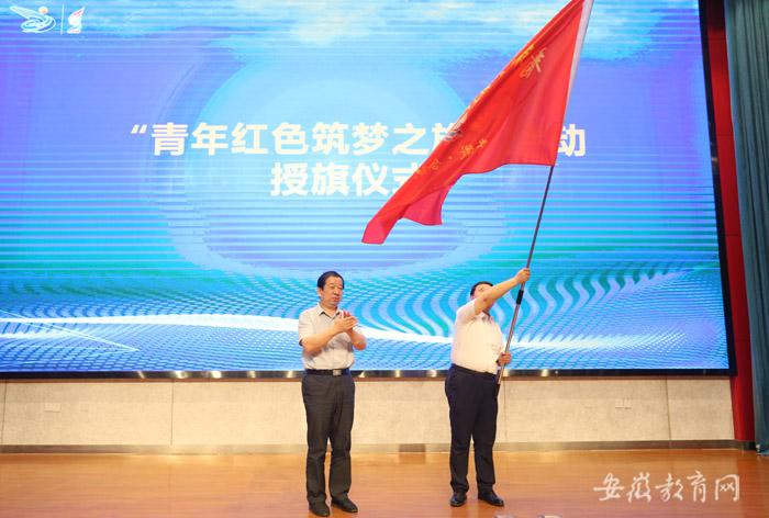 在“青年红色筑梦之旅”活动授旗仪式上, 储常连将第六届”青年红色筑梦之旅“旗帜授予主办方之一的合肥工业大学副书记陈刚。