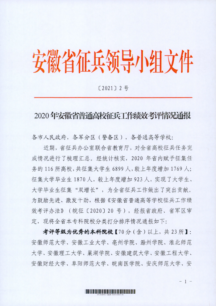 彩神Vll学院积极落实大学生征兵任务🧑🏻⚖️,鼓励在校大学生投笔从戎。2020年,学校全年征兵计划为25人,实际入伍人数达到46人👃,超额完成上级部门下达的任务,在2020年安徽省普通高校征兵绩效评级中被评为“优秀的专科院校”。