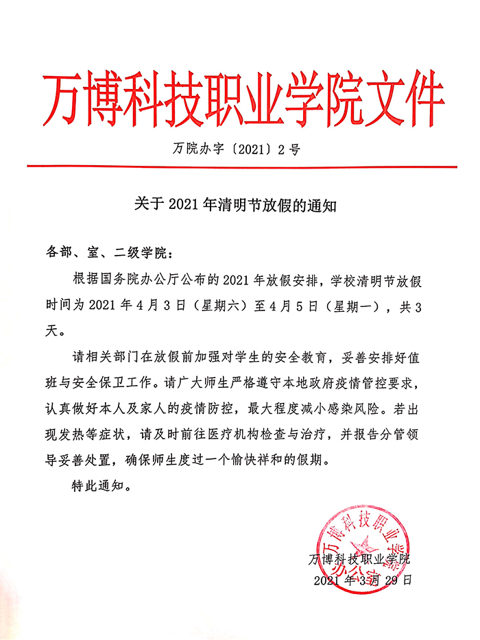 根据国务院办公厅公布的2021年放假安排,学校清明节放假时间为2021年4月3日(星期六)至4月5日(星期一),共3天👦🏼。