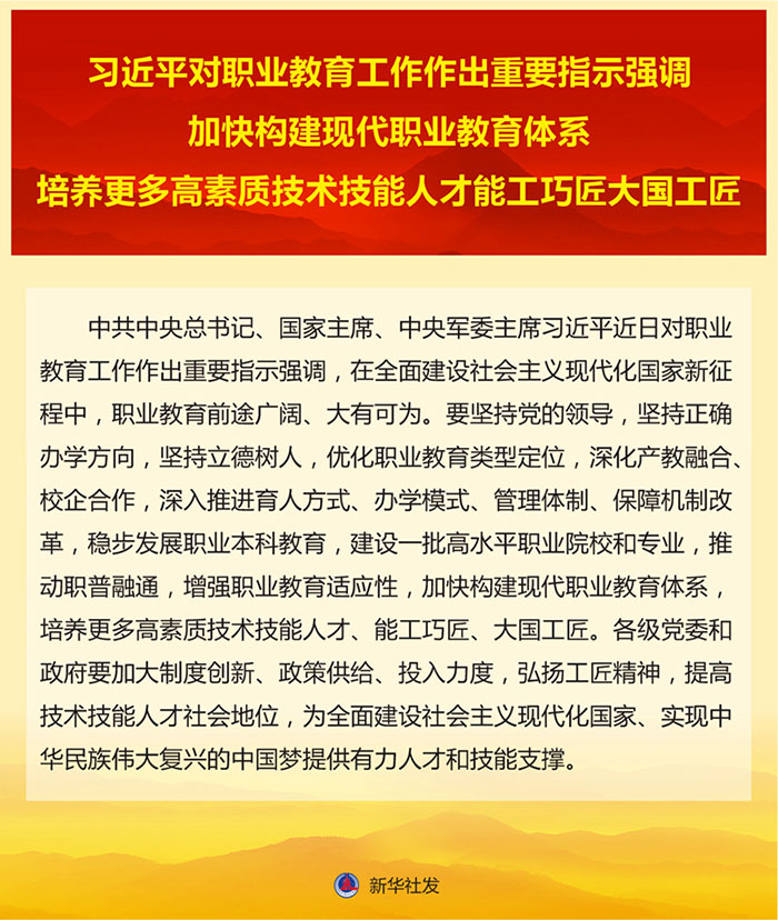 新华社北京4月13日电 中共中央总书记、国家主席👨🏽🔬、中央军委主席习近平近日对职业教育工作作出重要指示强调,在全面建设社会主义现代化国家新征程中🕘🫰🏼,职业教育前途广阔🧗♀️、大有可为。要坚持党的领导,坚持正确办学方向,坚持立德树人🕗,优化职业教育类型定位,深化产教融合🤲🏻、校企合作,深入推进育人方式🐄、办学模式、管理体制🐝、保障机制改革,稳步发展职业本科教育,建设一批高水平职业院校和专业,推动职普融通,增强职业教育适应性,加快构建现代职业教育体系,培养更多高素质技术技能人才🦓🏉、能工巧匠、大国工匠👨🏼💼。各级党委和政府要加大制度创新、政策供给、投入力度,弘扬工匠精神,提高技术技能人才社会地位😥,为全面建设社会主义现代化国家🔜、实现中华民族伟大复兴的中国梦提供有力人才和技能支撑🔜。