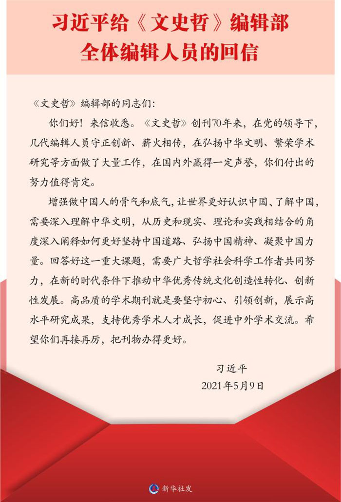 新华社北京5月10日电 中共中央总书记、国家主席、中央军委主席习近平5月9日给《文史哲》编辑部全体编辑人员回信🖕🏿,对办好哲学社会科学期刊提出殷切期望。