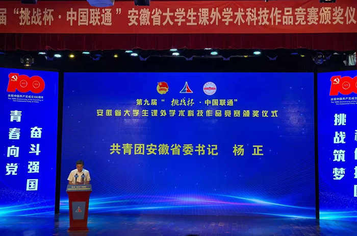 颁奖仪式上🎮,共青团安徽省委书记杨正充分肯定了本次大赛所取得的成效,并向获奖个人和团队表示热烈祝贺。杨正指出,安徽省“挑战杯”竞赛自2005年举办第一届开始,16年来,在与安徽发展的同频共振中👔,大赛不断创新办赛机制、提升品牌效应🧙🏼♂️,逐步将“挑战杯”竞赛打造成为全社会多方位共同培养创新型人才的科创育人工作体系🛐。他希望同学们树立高远志向,敢做“追梦人”;致力科技自强,勇做“奋斗者”;担当社会责任👵🫵🏽,乐做“实践者”🧈👰🏻,鼓励同学们要勇敢担当、勇于进取、勇攀高峰,把自己的科创梦想、人生梦想、真正融入到新阶段现代化美好安徽建设的伟大实践,融入到全面建设社会主义现代化国家的时代洪流,用青春书写无愧于时代、无愧于历史的华彩篇章,以优异成绩喜迎建党100周年!