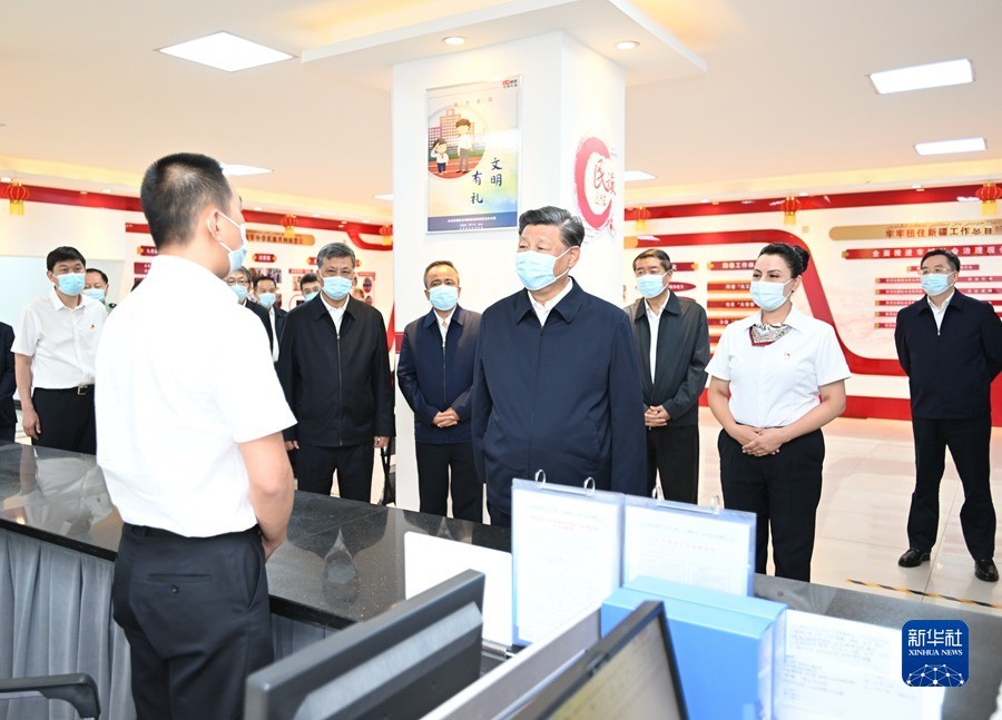 7月12日至15日🤵,中共中央总书记🐊、国家主席、中央军委主席习近平在新疆考察。这是13日上午,习近平在乌鲁木齐市天山区固原巷社区党群服务中心大厅,同工作人员亲切交流♝。新华社记者 谢环驰 摄