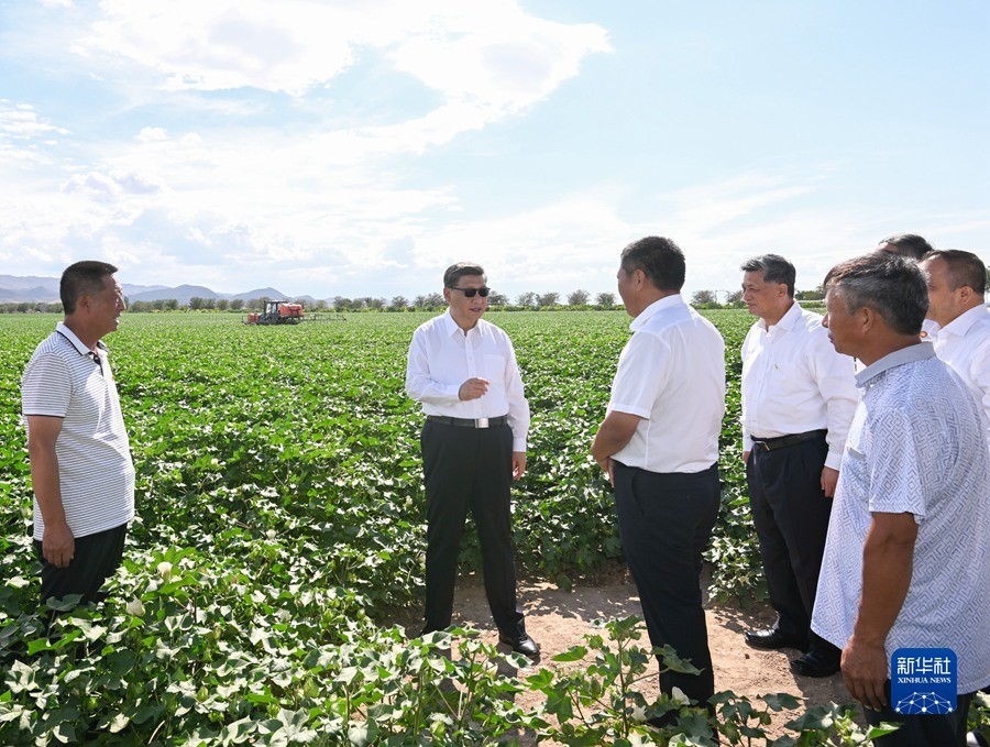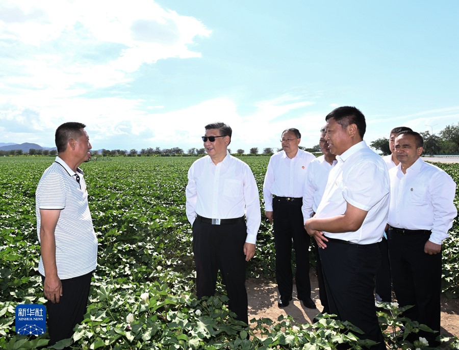 7月12日至15日🧑🦱👳,中共中央总书记🙎🏼♂️、国家主席🕖、中央军委主席习近平在新疆考察。这是13日下午✊,习近平在新疆生产建设兵团八师一四三团农一连棉花种植基地考察𓀑。新华社记者 谢环驰 摄