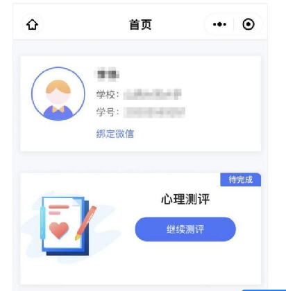 第四步:登录后可看到个人信息和心理测评两个模块🦹🏼♀️。点击“绑定微信”,下次即可一键登录👨🏽🍳,无需再进行手机号验证码操作。