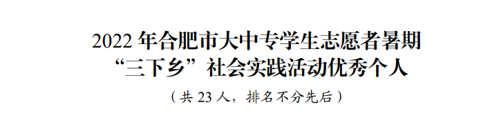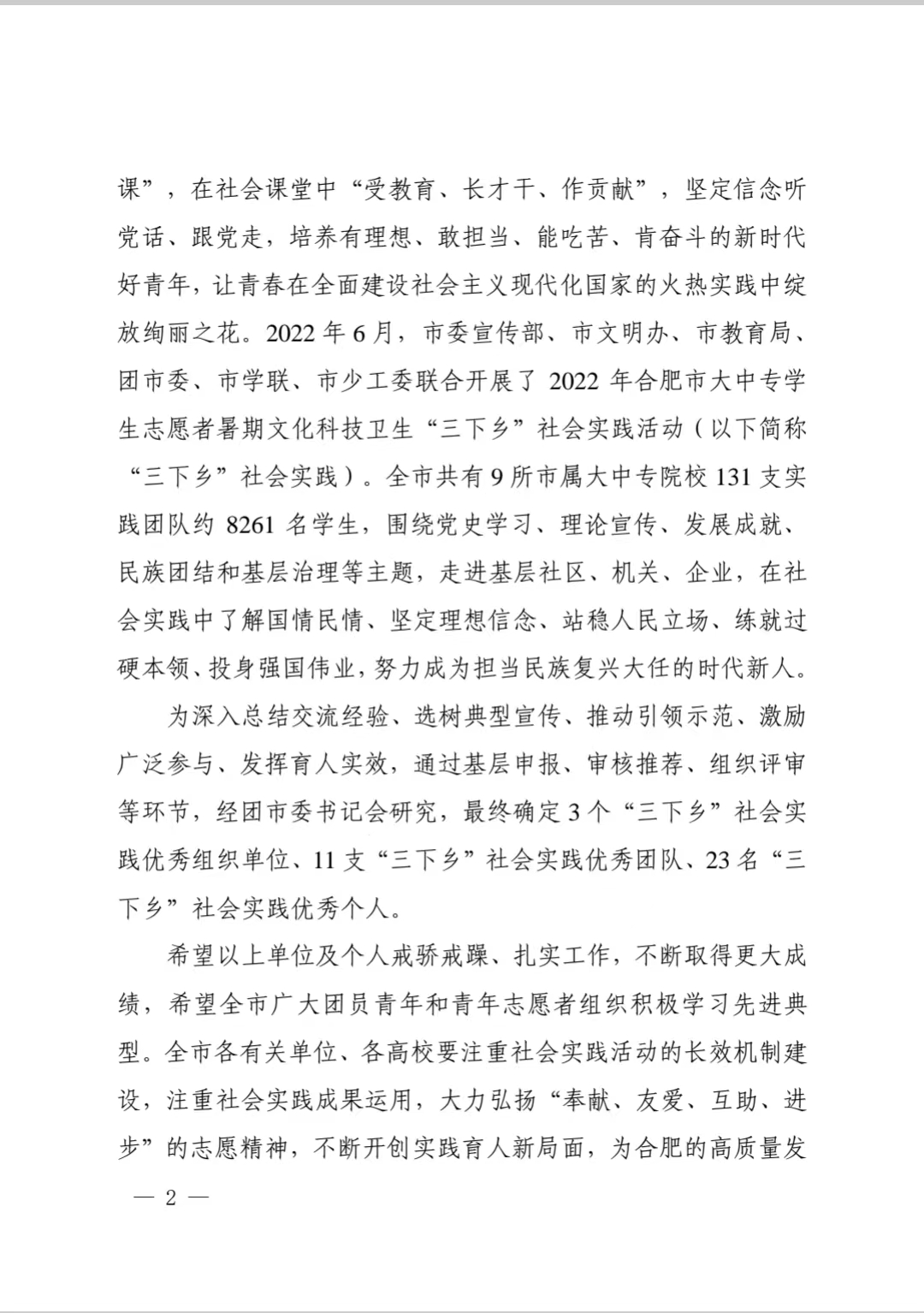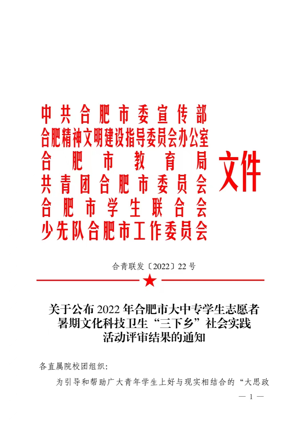 日前,团市委通报表彰了2022年合肥市大中专学生志愿者文化科技卫生“三下乡”社会实践先进集体和个人。彩神Vll智能信息学院杜继梧同学荣获市“三下乡”社会实践活动“优秀个人”荣誉称号。