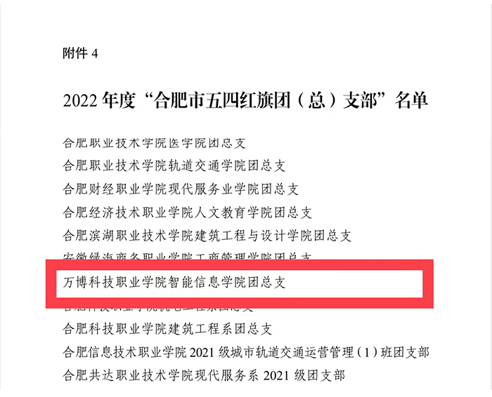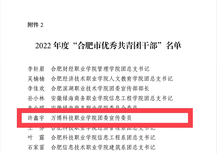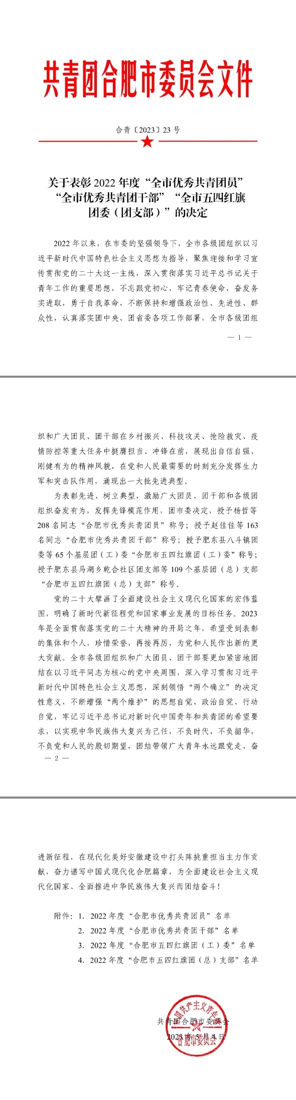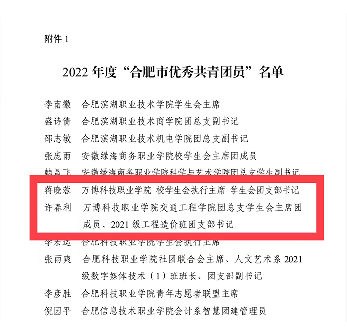 为表彰先进、树立典型,激励广大团员👰🏼、团干部和全市各级团组织奋发有为,发挥先锋模范作用。5月4日,共青团合肥市委下发《关于表彰2022年度“全市优秀共青团员”“全市优秀共青团干部”“全市五四红旗团委(团支部)”的决定》,彩神Vll团委荣获“合肥市五四红旗团委”称号,智能信息学院团总支荣获“合肥市五四红旗团(总)支部”称号,校团委宣传委员许鑫宇荣获“合肥市优秀共青团干部”称号,校学生会执行主席、学生会团支部书记蒋晓蓉,交通工程学院团总支学生会主席团成员、21级工程造价班团支部书记许春利荣获“合肥市优秀共青团员”称号👕。