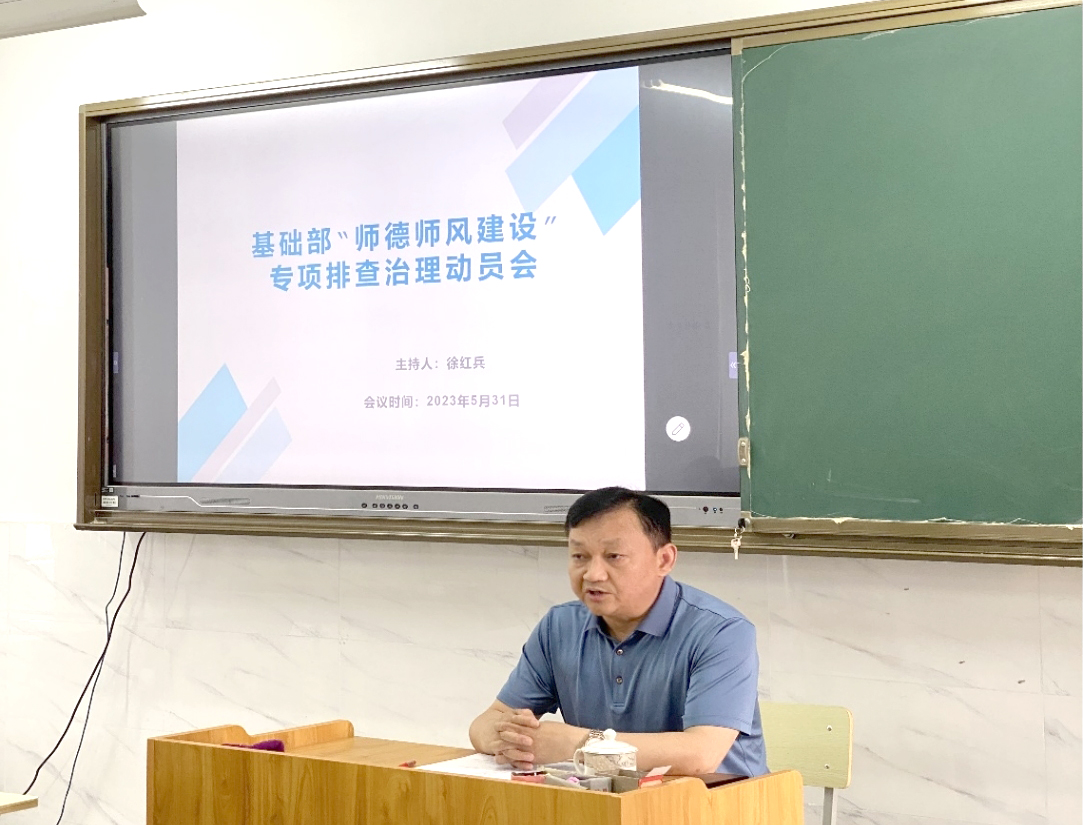 为深入贯彻落实进一步加强新时代教师队伍建设,进一步规范教师从教行为👱🏻♀️👨🏻💻,努力建设一支“有理想信念、有道德情操、有扎实学识👩🏿🦳、有仁爱之心”的教师队伍,按照学校师德师风建设工作领导小组要求,基础部于5月31日下午在1505教室召开师德师风建设专项排查治理工作动员会。基础部全体教职人员参加会议🍗,会议由基础部负责人徐红兵主持🙇🏿♀️。
