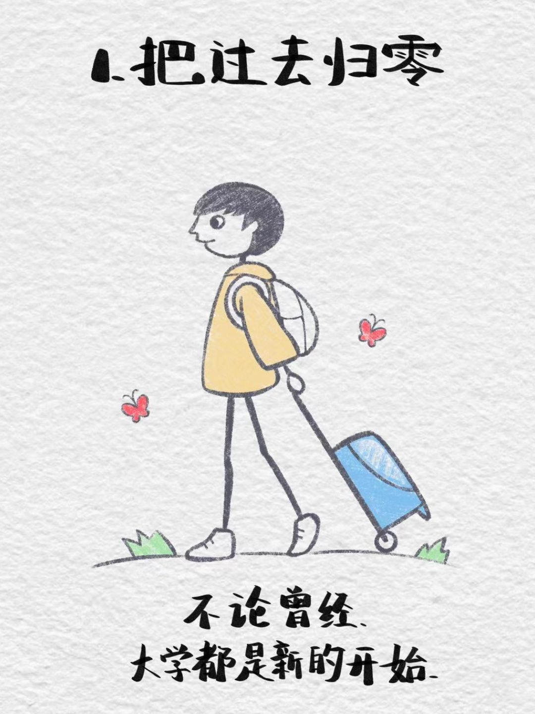 1.把过去归零。不管过去的你多么优秀,抑或是能力一般,那都是过去,上大学后记得把过去归零,一切重新开始。不要把过去的优越感带到学校🧽,也许这里的每一个人都比你优秀,但也不要自怨自艾😙,你可以好好通过大学提升自己,实现弯道超车。
