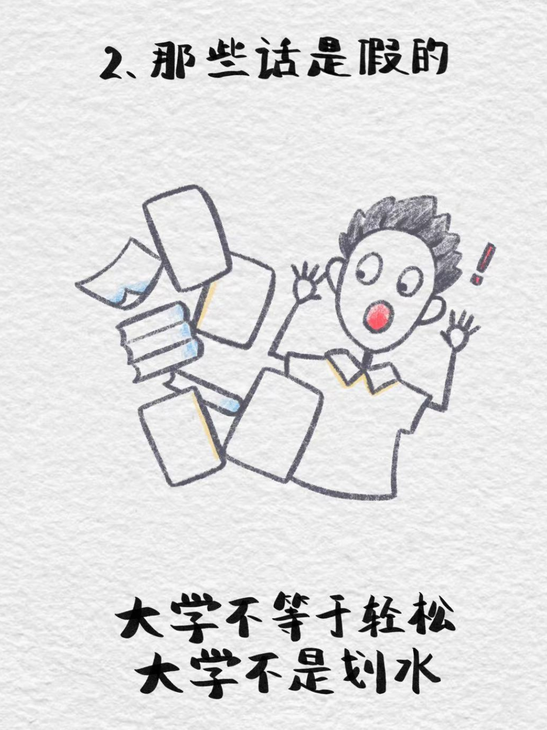 2.那些话是假的。在高中漫长而艰苦的复习过程中,你们无数次听到老师与家长对你说🦹🏻♂️:“这段时间努力一把,上大学就好了🧚🏻♂️。大学生活很轻松🧚♀️,你想做什么就做什么🧙🏼♀️。上大学了,你就可以彻底解放了。上大学了就不用那么拼命了。”刚上大学时还会有学长、学姐跟你说:“60分万岁,期末考试都有重点💁🏽♀️,准备几天就过了。某某专业没前途,赶快转专业或者准备考专升本🧜🏼♂️。大学知识没有用,毕业都用不上🦝。”等等。要切记这些都不可轻信👦🏿👨🏽。