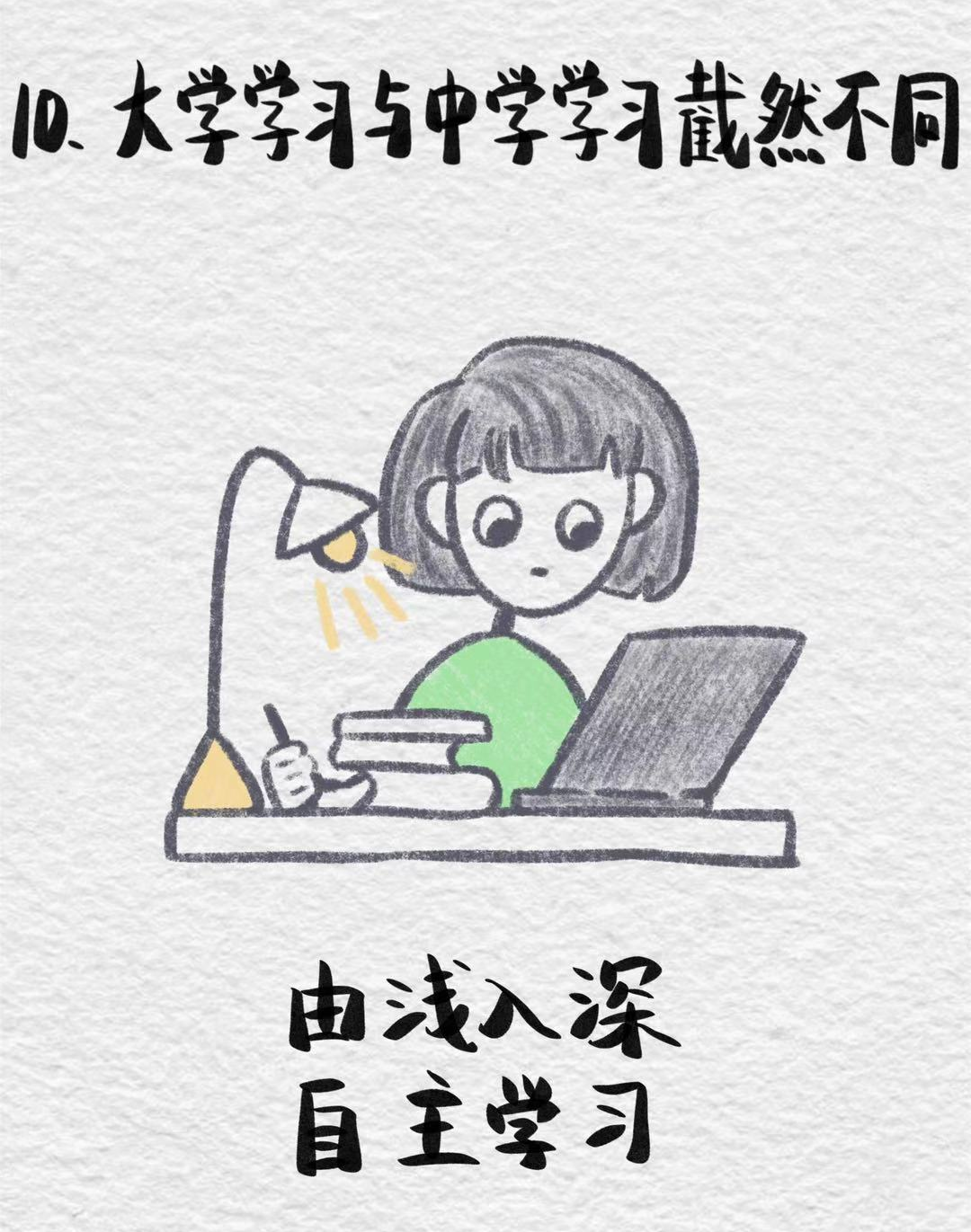 11.自主学习很重要。大学的学习是自主自觉的,没有人会赶着你。图书馆资源一定要好好利用,课堂上的书本知识只是皮毛,你要有计划📈🦔、有系统地广泛阅读课外专业书。大学学习还需要你有创造性💃🏼🧜🏼♀️,保持好奇心👰♂️,能提出自己的观点和主张,学会撰写论文✌🏻,甚至在高年级形成一定的研究方向。也应该积极参与各种提升职业技能的学习和实践。
