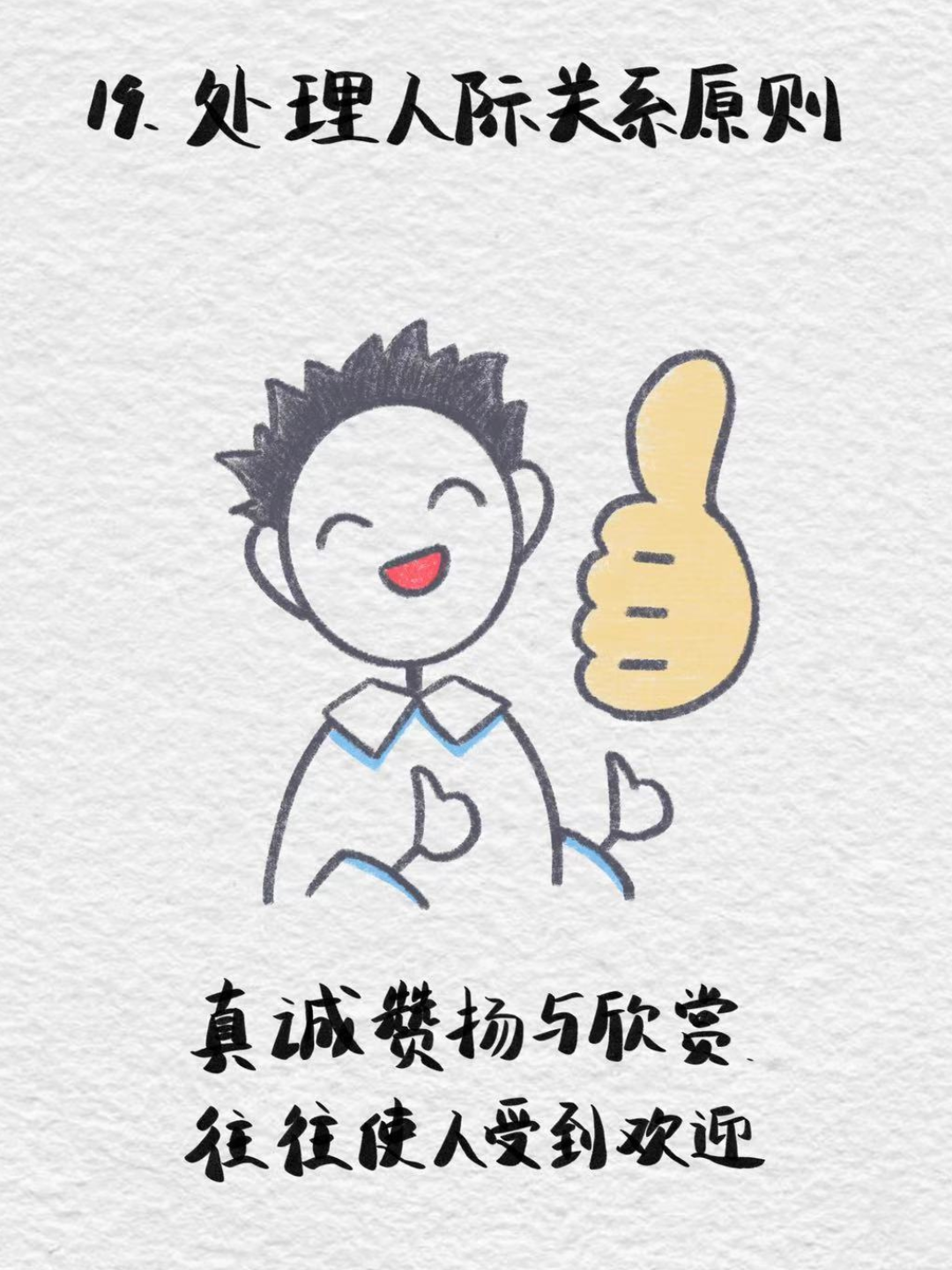 19.处理人际关系的原则💚。良好人际关系能提高学习效率、完善自我意识🧏♂️😄、促进心理健康。坚持真诚待人、宽容待人↔️、平等待人原则。交往中不要总是批评、指责别人,而应真诚地赞扬和欣赏别人。与人交谈时👳🏽♂️,要善于倾听,少说多听,这样的你一定会受到欢迎。