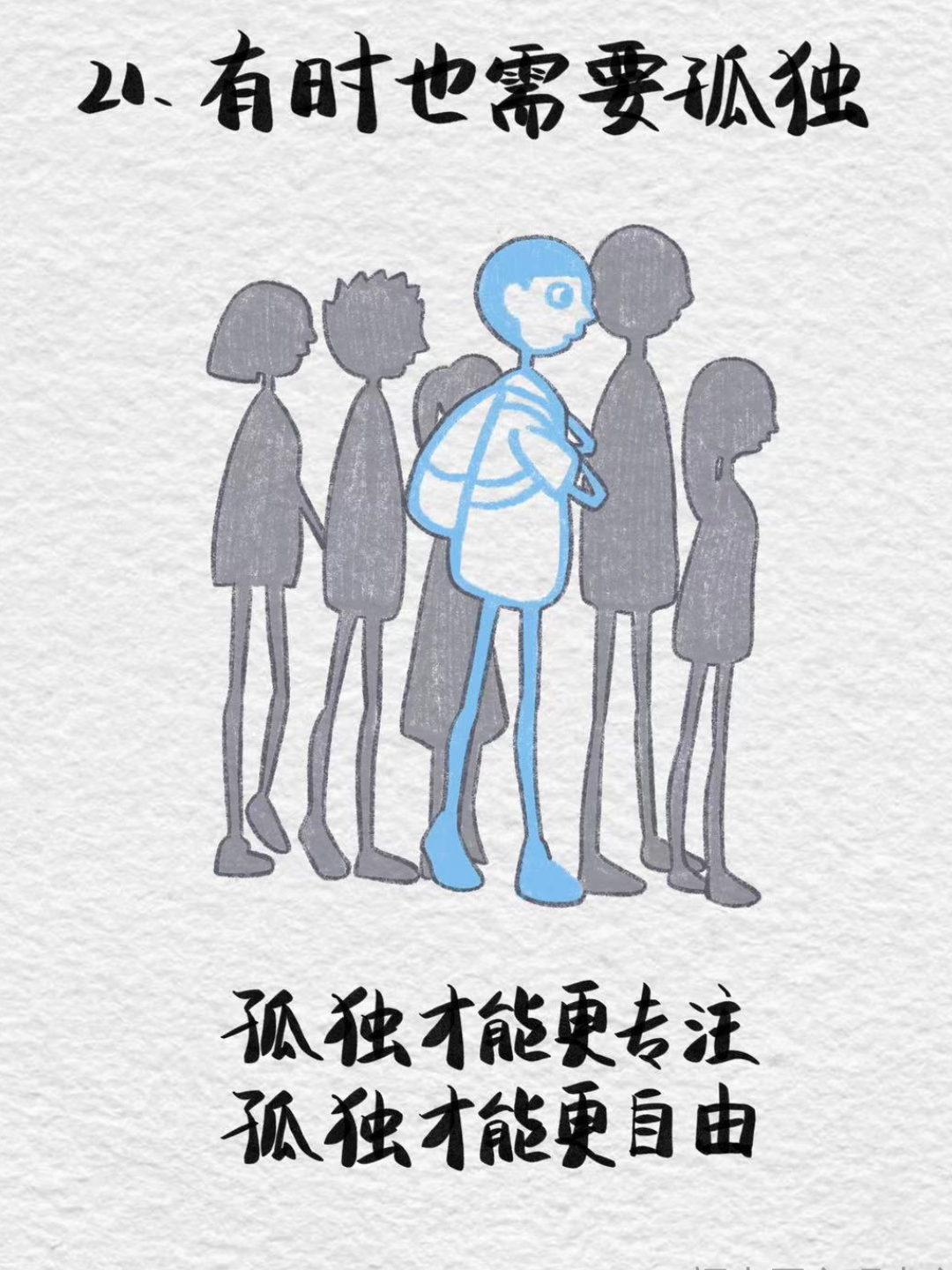 21.有时候也需要孤独👈。如果你发现自己很长时间都是一个人去食堂吃饭或者去上自习,别在意,大学里一个人是正常的,你觉得孤独👩🏻🦽?或许你就喜欢这样,孤独的你才能更专注,才能更自由🤰🏽,只要你自己觉得过得很充实,感觉到幸福快乐就不需在意别人的眼光。