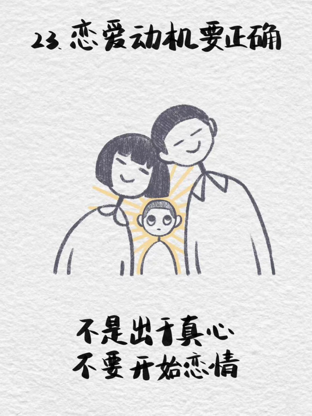 23.恋爱动机要正确☠️。很多同学在恋爱之初,动机是不对的,不是真心的喜欢而在一起,有的是为了缓解寂寞👧、孤独,或者是因为别人起哄,或者是与宿舍同学打赌🏉🤺,或者是因为看到大家都在恋爱,就也要找一个,省得被落单。如果你是这样的,请不要开始一段恋爱。