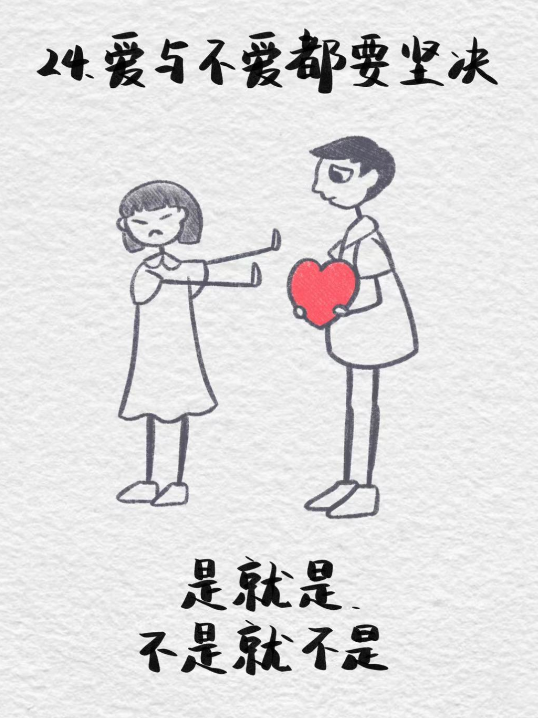 24.爱与不爱都要坚决。如果爱就勇敢说,如果不爱就坚决拒绝🩼。如果你很了解他(她),也真心喜欢他(她)💆♀️,就勇敢地告诉他(她),追求你真正爱的人,只要自己认为值得,那就是值得的。“我爱你”这句话别对很多人说,希望你可以把这句话说给你心中真正最爱也最值得的人🗝,这是尊重你爱的人,更是尊重你自己的感情👩🏽🍼。拒绝爱要坚决🤟🏼,爱你的人,向你表白时,不管你接不接受,你都应该感谢对方👨🏼🔬,这是对他们的尊重。如果你不爱他🧑🏿🦲,他又向你表白了,一定要肯定回答,是就是🔁,不是就不是✶,不可以模棱两可🛑,给予他人盲目的希望。如果恋爱过程中🚵🏿♀️,你看清了一个人🌅,请你学会及时止损🧑🏻🏫,勇敢的说再见🫚。