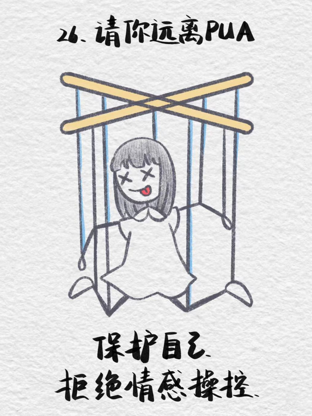 26.请你远离PUA。大学生一定要认真考察自己的恋爱对象#️⃣👰🏻♂️,只要你发现你们之间的恋爱关系不平等↪️📤,经常感觉到低自尊🎀☪️,没有自己的想法,也感受不到快乐,好像陷入了情感操控🏝,请你立即“撤退、远离”📐,这是保护你自己的最好方式。
