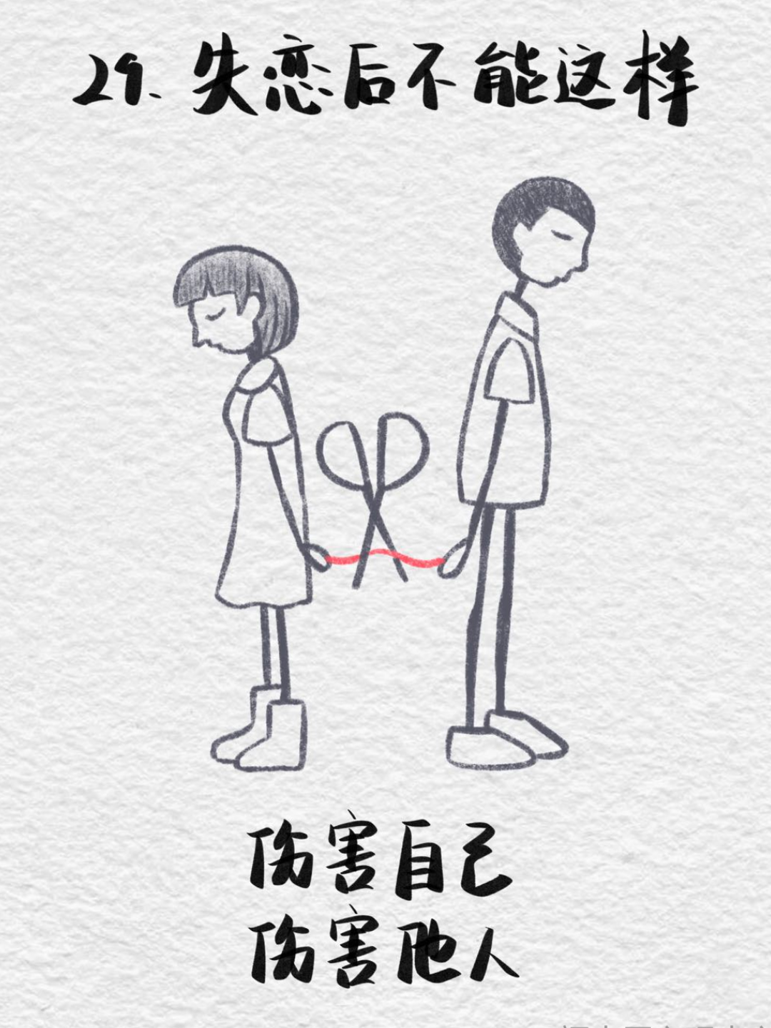 29.失恋后不能这样。记得哦,失恋后最好不要继续做朋友★,如果继续做朋友会带有很多情愫🫛,恋爱就会分得不彻底,痛苦就会被延长🥔。不能自暴自弃,更不能伤害自己,不能报复和伤害别人🤸🏼♂️,也不能马上找个替代的人来安慰自己受伤的心灵。