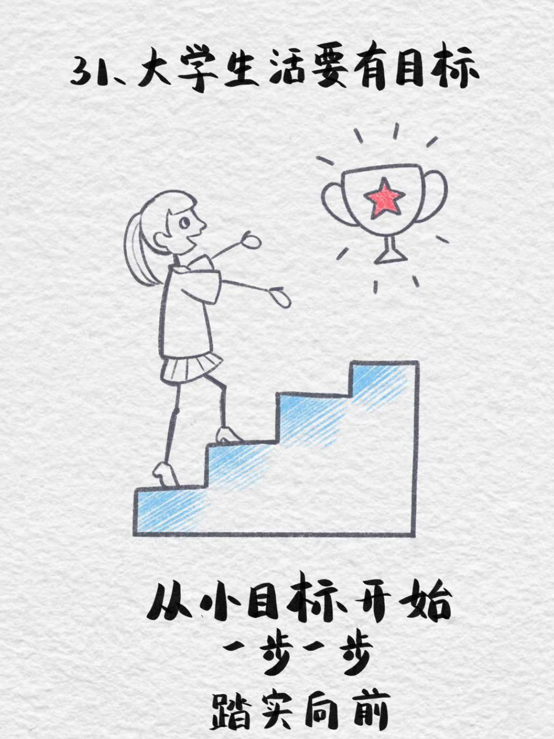 31.大学生活需要有目标。不要总是觉得目标很虚,很空👩🏻🦼➡️。一个人是否有目标,对待生活的态度是截然不同的。上大学后要给自己的每天、每周⬆️、每月、每学期、每年都定一些目标,有了目标🙋🏼♂️,你的生活就会过得更充实。记得哦,可以把目标进行分解🧑🏿🍳,越细越好🚝,从小目标开始,一步一步脚踏实地向前走。
