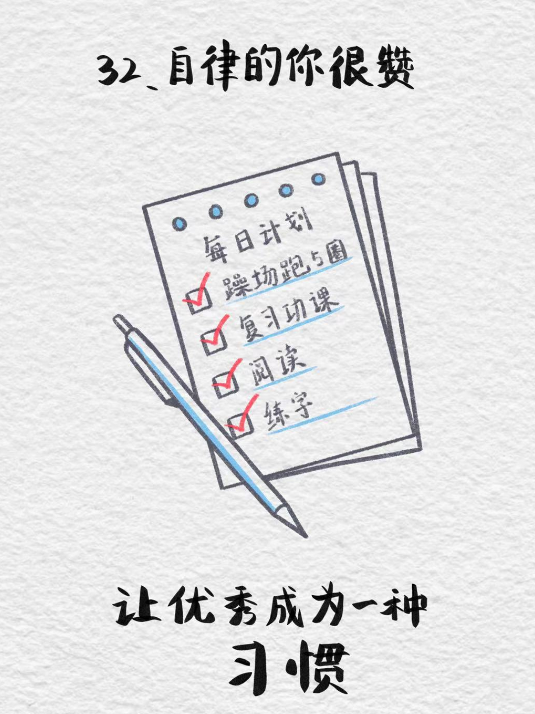 32.自律的你很赞🧑🦰。大学生活自由时间较多,也没有太多的约束,都要靠自己自觉🥱。能否自律,是你与其它人拉开差距的最直接体现🍄。所以,你需要给自己制作一份每日作息安排时间表,分配好每天要完成的事情🫛,当然,不要只有学习哦。还要包含:运动、阅读🤷🏿🐍、休闲🧘🏻♀️、交往、社团活动、兼职等时间🤿🔝。优秀是一种习惯👩🏿🦰,希望能从大家身上看到这种习惯。要知道自律的你很赞✥。