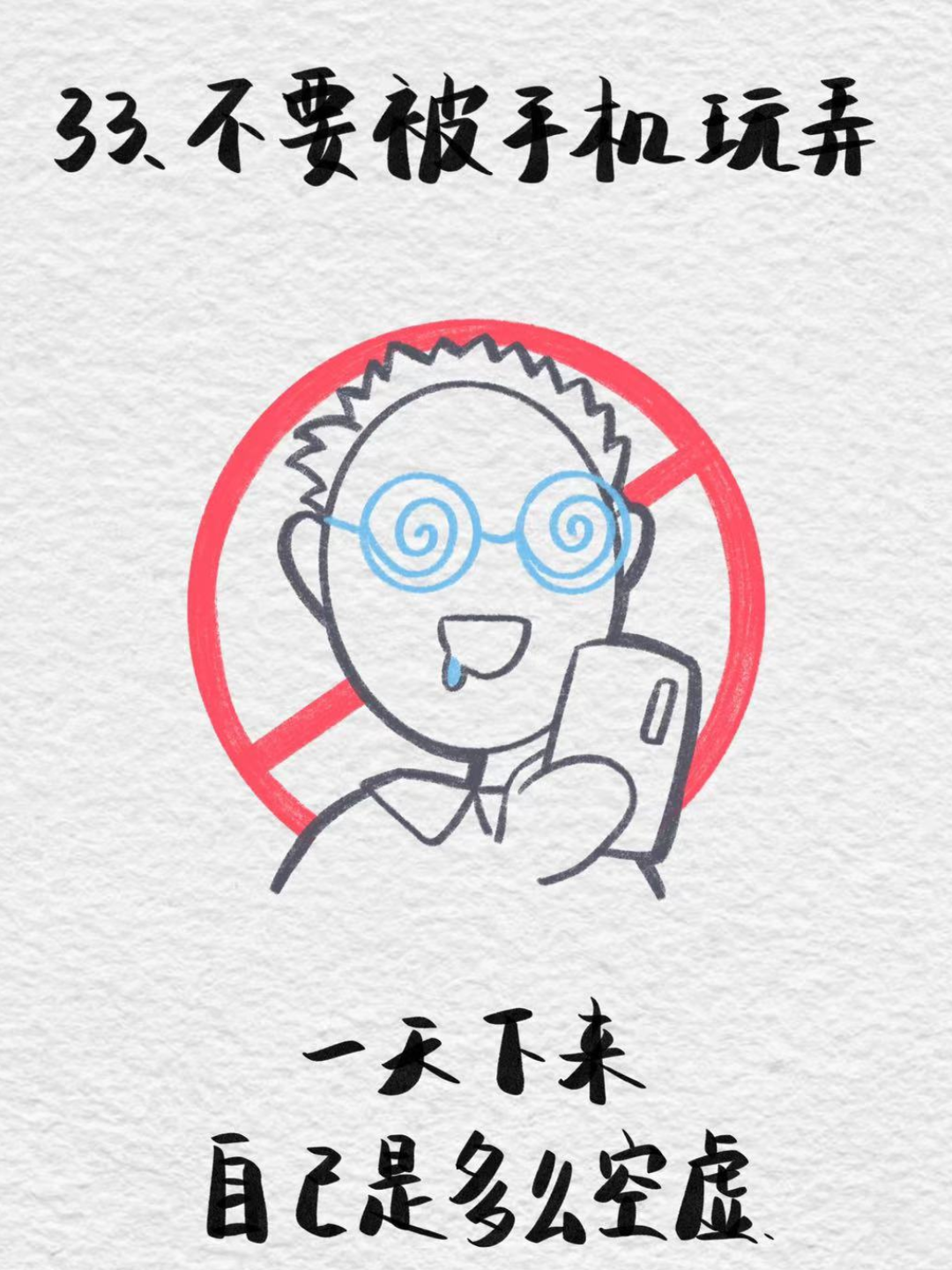 33.不要被手机玩弄。一天中你到底花多少时间在手机上呢🈯️🧁?很快⛅️,你可能会被不自律的自己打败👁🗨,上课玩手机、宿舍休息玩手机👈🏽、吃饭玩手机❎🪙、走路玩手机🏨🧗🏼♂️、图书馆自习玩手机。你以为是在你在玩手机,其实是你被手机玩弄。B站👨🏿🚒、抖音♒️、淘宝、微博、朋友圈控制了你的大部分生活👩🏼✈️,其实,一天过去回过头来你会发现自己的生活是多么空虚。