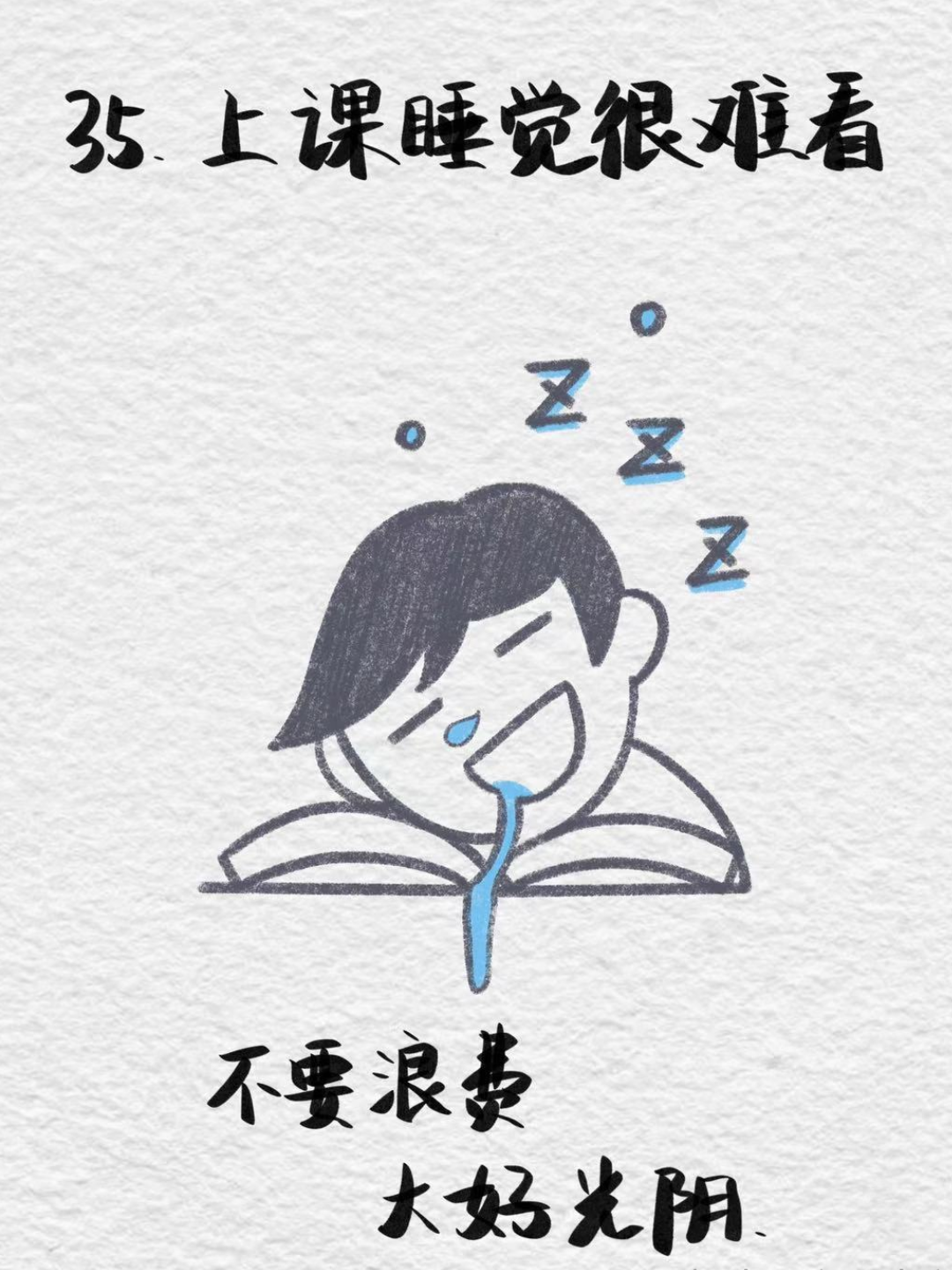 35.上课睡觉很难看。上大学一段时间后你可能会在上课时睡觉。大学初体验,你可能有些失落🧚🏿♂️,可能很迷茫🤱,可能对课程没兴趣,也可能老师上课你不喜欢🫒,也有可能晚上你把精力都放在游戏和刷剧上,白天没精神上课。我希望的是你能自律🪣,尊重每一位老师,永远不要嘲笑你的老师无知或者单调©️,因为有一天当你发现你用瞌睡来嘲弄老师实际上很愚蠢时,你在社会上已经碰了很多钉子了🤷🏽♀️🧀。再者,如果你实在听不下去🤷♂️,你可以做自己的事情,可以自己看书。总之,不要浪费大好时光就行👧🏼。