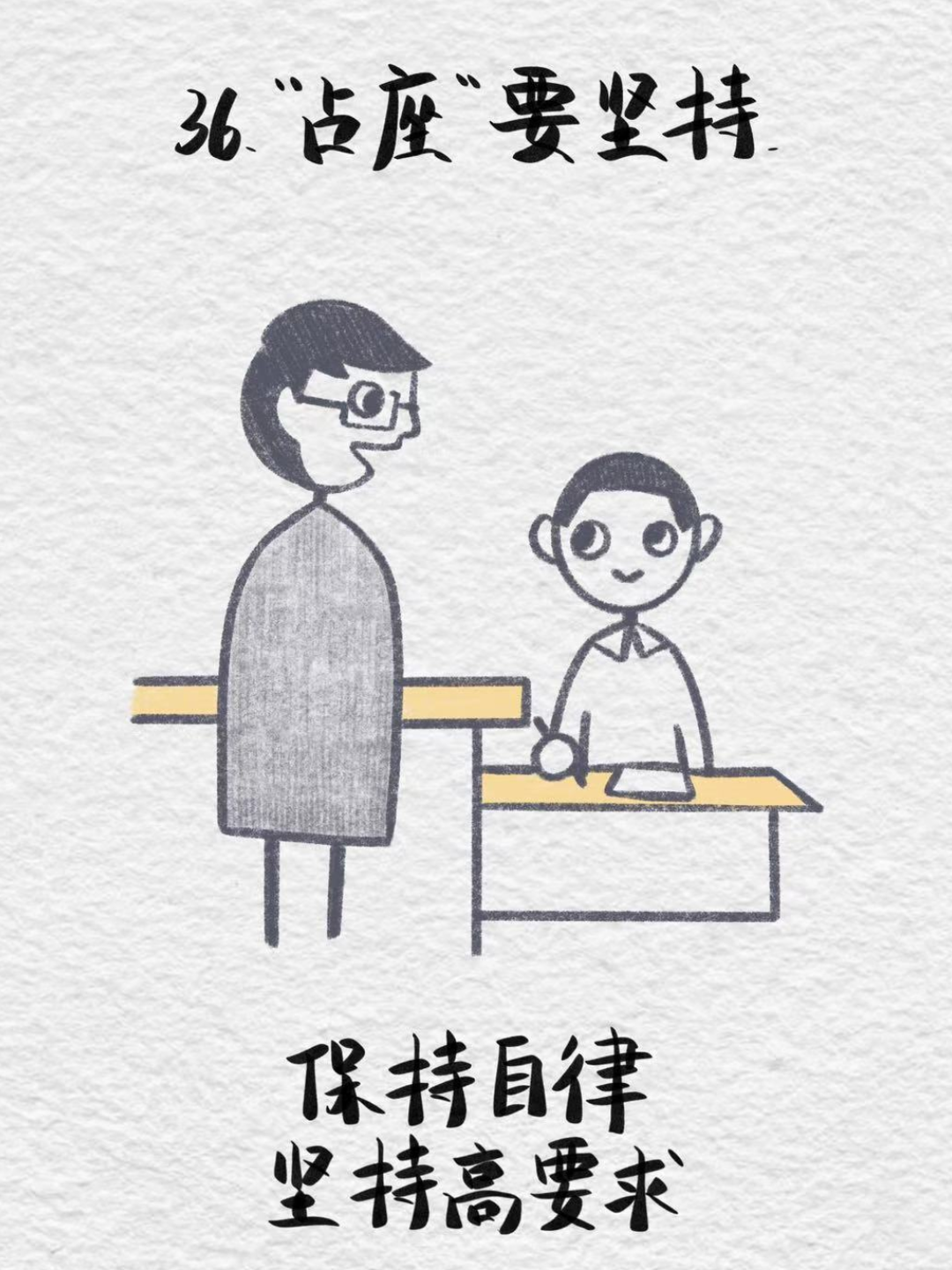 36.“占座”要坚持🤵🏿🫲🏼。开学初,你们会有很高的期待🦸♀️,也会严格要求自己,甚至会出现上课提早“霸位”现象,上课时认真听讲,课后也会很认真的坚持写作业,复习、预习🧑🏿🚀。晚上的教室或者图书馆也会被占座。这是好事🖇,但是🐜,希望你们能坚持🚴🏻,更希望你们能真正的把你占的位置用起来,不要让它空着🚵🏻♂️。你没去自习时,自觉把书本等占位的东西带走,给别人留点机会,这是你有素质的体现。