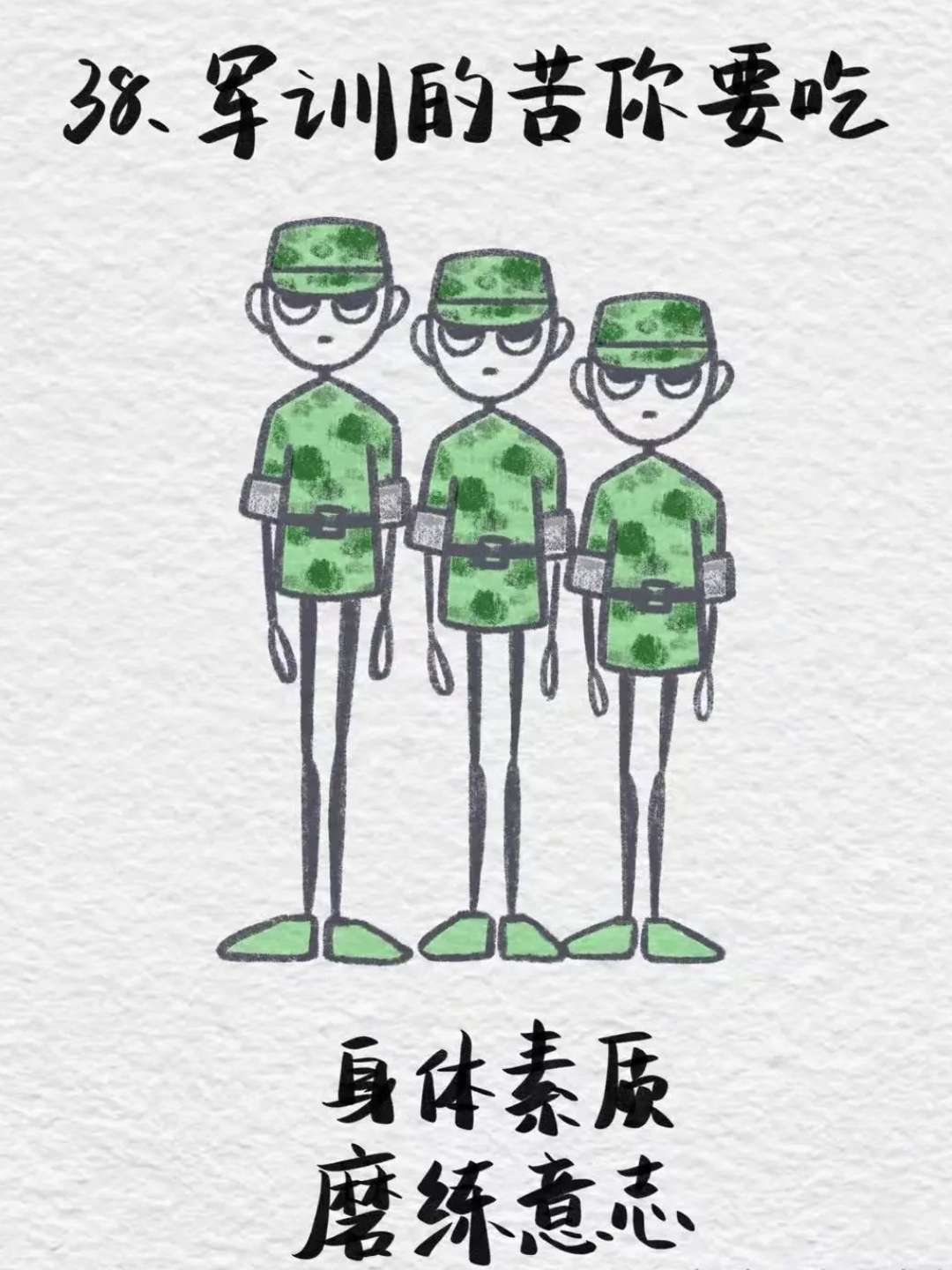 38.军训的苦要吃。军训是你们入学的第一课,是你们接受国防教育的一课🧆,也是提升你们身体素质的一课,更是磨练你们意志的一课。至于苦与乐🤛🏿,只有经历过的人才知道其中的感受🪦。等你走过军训这段时间,你才会怀念那一段短暂的时光,它会给你留下很深刻的印象,美好的回忆🍪。所以🏖,希望大家好好珍惜🅾️,不要以各种理由申请免训🪣,或者总是找借口坐在旁边观看🏇,抑或是一点点小困难就坚持不了。