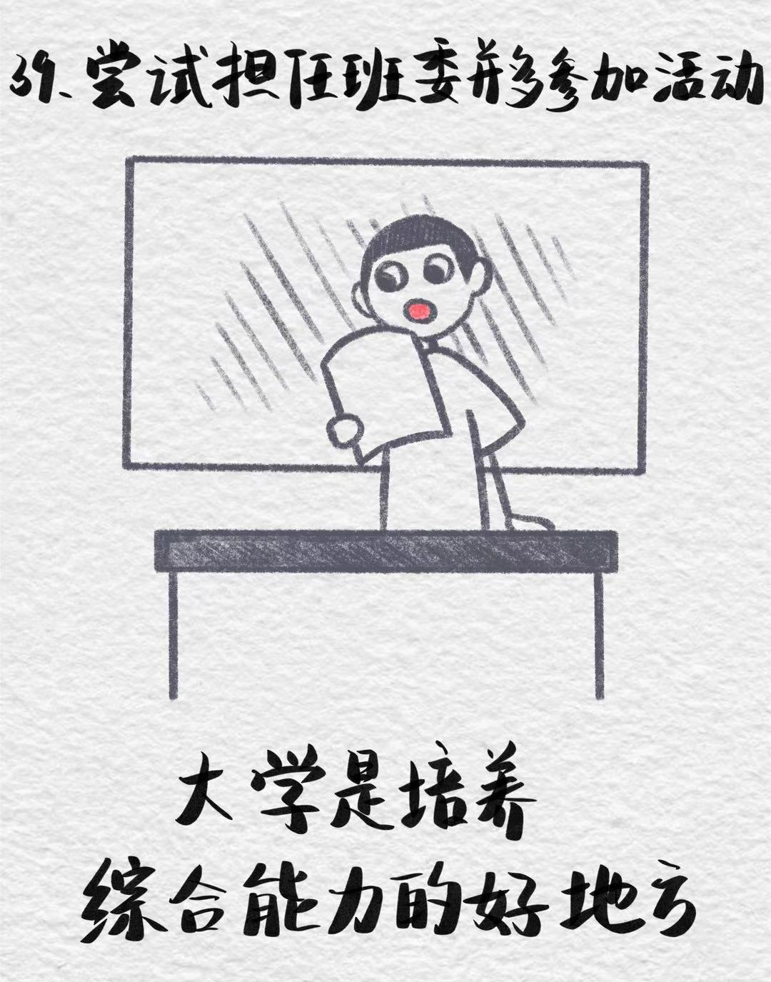 39.尝试担任班委并多参加活动。前面已经说过,大学是培养你综合能力的地方,大一新生的你👬,我建议你们积极去竞选班委或者学生会干部,你需要通过班委或者学生会干部来提升自己的综合能力👰♀️。当然,不管你做什么,都请用心的、负责任的去做,这样才对得起你自己,对得起选择你的同学。另外,请你一定要积极的去做事情🎭,去服务同学,只有这样才能真正的锻炼到自己🛕🆚。同时,我也希望同学们积极参加学生活动或者比赛👩✈️🧖🏻,通过参加活动或者比赛提升自己的能力,同时结识朋友和获得个人自我成就感。可根据自己的兴趣或者专业发展参加社团活动👩🍳🍞,记得社团活动适度就好,选择后再投入、做精,这对自己是一个拓展。