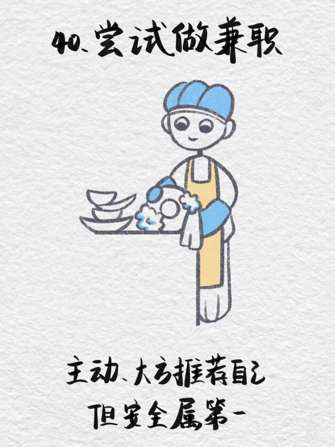 40.尝试做兼职。上大学的你是不是也想做做兼职🙇🏽♀️,为自己挣点生活费呢👨🏿🌾?这很好啊𓀇,兼职的种类有多种⛔,你要有所选择,如:校外的兼职——家教、服务员、送快递等;校内兼职--勤工助学岗位、校内送餐等等⛹🏿♀️。兼职确实能提升自己的能力🕵️♂️,还能获得一定的收益,能减轻家庭负担🤵♀️🦹♂️,也能提前接触社会,这是好事🟡,有机会可以去尝试🦹🏿♂️。当然⛏,做兼职一定要留个心眼📦,不要被骗了,安全是最重要的。所以🏋🏿♀️🤯,建议最好在校内做兼职。记得哦🤞,校内勤工助学岗位是比较多的🙋🏿♀️,你要自己主动、大方的去推荐自己。