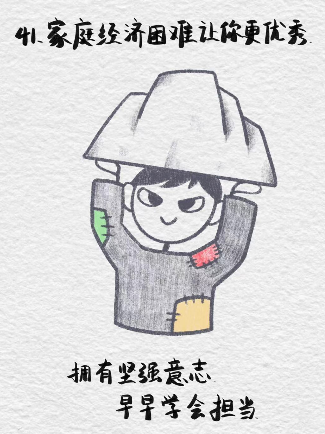 41.家庭经济困难让你更优秀。家庭经济困难也许在当下给你带来了一些困扰。但是,家庭经济困难的孩子有坚强的意志,懂得知足常乐🎱,渴望美好生活,努力上进,早早就学会了承担责任🟥。所以不要妄自菲薄,变的自信一些,要有自己的目标与梦想,并且要求自己不断为之而努力🙍🏿。当然,如果你的家庭经济条件一般🔨,永远别乱花钱🎧。