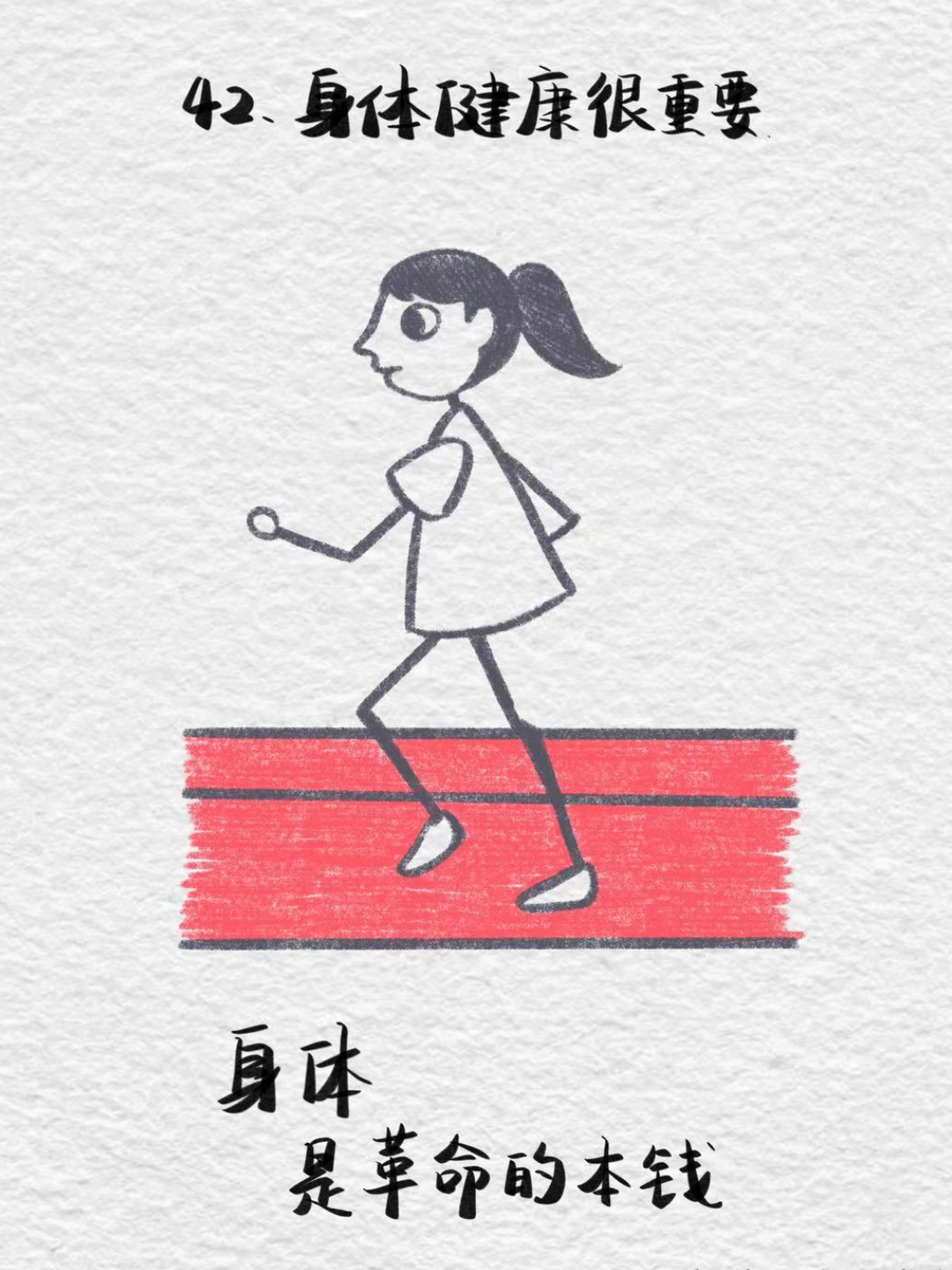 42.身体健康最重要🧔🏼♀️。上大学后,没有了父母的唠叨和监督,你可能会疯狂熬夜打游戏👨👧、刷剧、逛B站等💆🏿♀️。不要总是那么懒,总是点外卖🍦,也不要那么贪吃,路边摊的东西不一定好。虽然这是生活的一部分🪷,但是请大家适度。尽量规范作息时间,按时睡觉🧻🤱🏼,按时吃饭,身体不舒服了要及时重视。一定要每天抽出点时间来运动,身体健康了,你才能完成其它的梦想♑️。