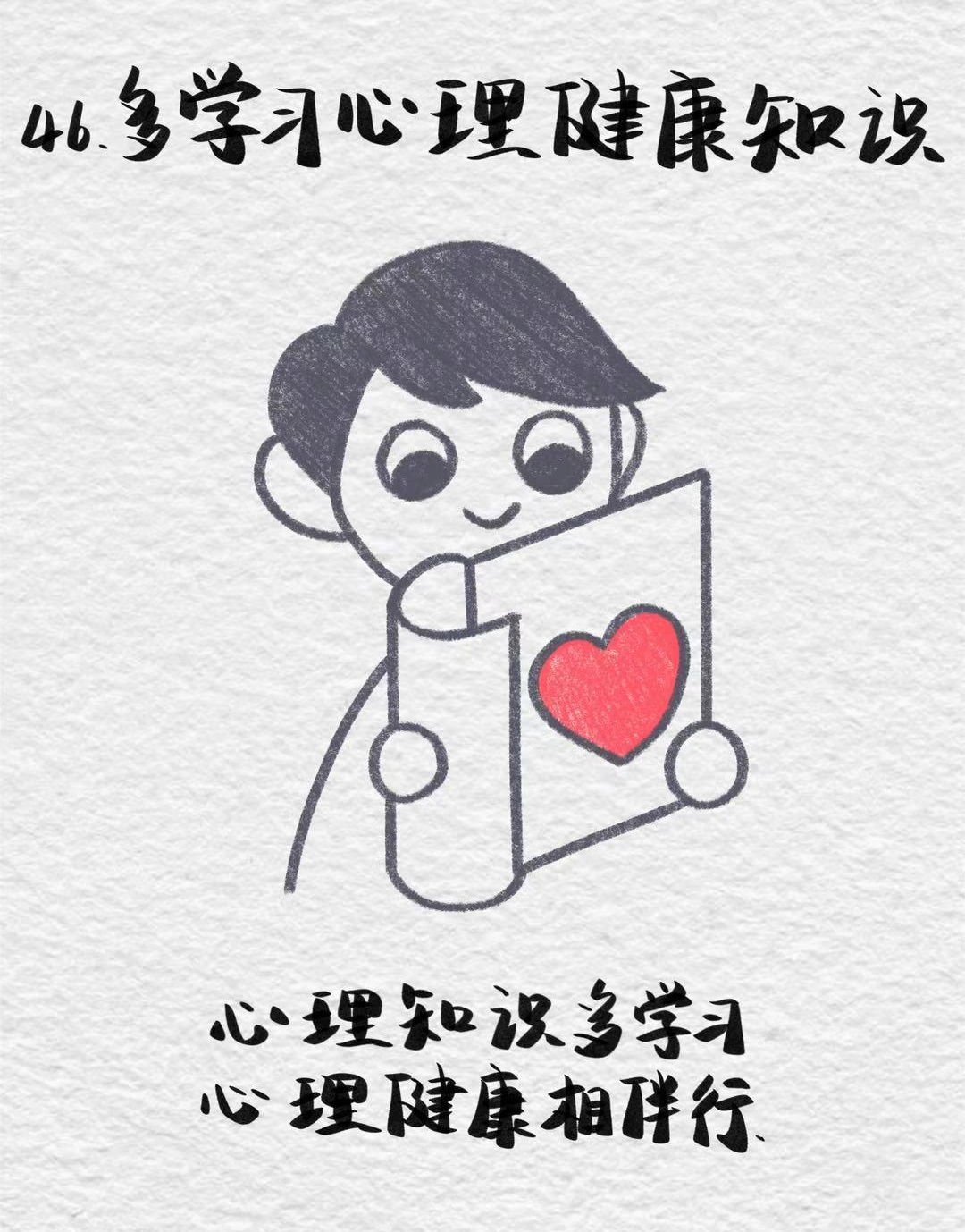 46.多学习心理健康知识👮🏿。心理健康是健康的重要组成部分🎆,多学习心理健康知识,对你获取积极心态很有帮助,也能帮助你应对生活中的困难和挫折🤷🏿,还能提升自我效能感,让生活更加幸福🧑🦳。遇到困难的时候学着换一种积极的思维方式🚵🏼♂️,积极心态会助力你克服困难🛀🏻。
