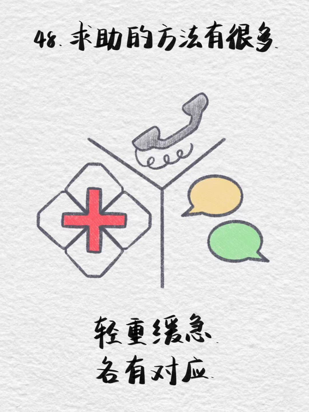 47.寻求帮助是智慧的表现。国家卫健委发布的心理健康素养十条中,有一条明确说明,懂得求助是一个人智慧的表现。如果你有心理困惑,要根据自己的情绪表现和症状特点,适时适当的求助,不要隐瞒疾病,也不要扩大疾病的症状,及时寻求专业帮助🙆。