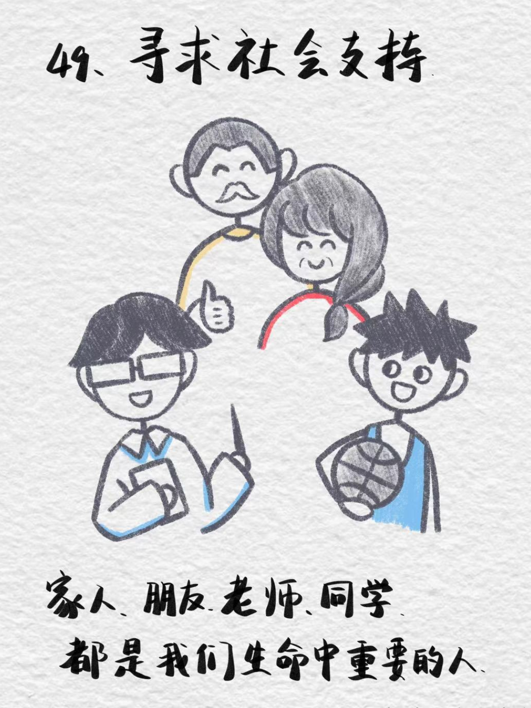 49.寻求社会支持。同学们📆,我知道你们在学校心灵受伤后不想让父母担心,不想让学校知道🧔🏽♀️,不想让辅导员知道,甚至不想让同学和朋友知道👨🏼✈️。但你要知道父母是我们最温暖的港湾,我也知道你们怕他们担心🥌,怕他们不理解🙎♂️,甚至担心他们会认为你装病,你选择自己承受🖕🏿,可是此时的你心里比任何时候都脆弱,比任何时候都渴望父母的理解与支持。有心理困扰后⛅️,你不敢让学校老师知道,你不敢让宿舍同学知道🧓🏽,你也不敢让朋友知道,担心大家知道后会把你当做异类👩🏿💻,会疏远你,可是这样的你真的很痛苦,你的生活被限制了,你甚至回避各种社交😑。有心理困扰后🕺🏻,你不敢去寻求专业的心理咨询或者心理治疗帮助,因为你觉得心理咨询没有效果,你担心自己的问题被暴露,你担心学校会对你采取一些特殊措施🥠🩲,使自己的问题更加曝光出来,你更不敢去医院看精神科,因为你不敢接受那样的结果🥜🏌🏿♀️,你怕那个标签,你更怕药物有严重的副作用。可是,同学们,你们知道吗?家人🚶♀️➡️、朋友、同学、老师💛,他们其实都是我们生命中最重要的人。如果你可以坦诚的向他们表达自己的情况🧑🎓,向他们诉说你的渴望,大家会更愿意选择去帮助你🤵🏽,你的症状可以在这些温暖之中缓解很多。