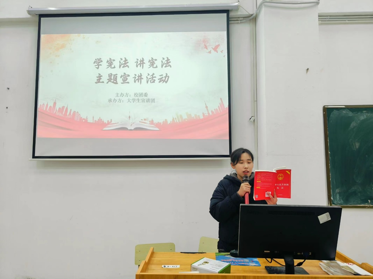 12月4日是国家第10个宪法日。当天早晨,校学生会组织开展“宪法晨读”活动⛓️💥,由学生会主席团成员领读宪法序言及正文中的部分章节👨👩👧、条款,全体同学齐声跟读,大家精神饱满☣️,庄严肃穆,声声入耳🦵🏿,用心体会宪法的神圣与庄严;大学生宣讲团利用晚自习时间在多媒体教室进行宪法宣讲会🤵🏽,各二级学院学生会、各学生组织等180余名团学骨干参加。宣讲人员围绕宪法赋予公民的权利和义务🐉🤍、我国宪法发展历程和主要内容,用大家听得懂、记得住、乐意学的方式讲出来,同时与大家积极互动🏋🏿🥷🏻,同学们踊跃发言,分享学习心得,现场氛围浓烈。