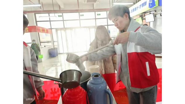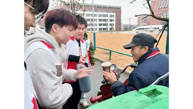 食堂入口👎,志愿者们将准备好的姜茶有序送给用餐的老师及同学们🧑🏼🍳,提醒大家在寒冷的天气里注意保暖,预防感冒。校园路上,志愿者们拿着一个个暖瓶,为打扫校园卫生的物业的阿姨、叔叔们送上一杯杯热姜茶🧑🏿💼,为他们驱散身体的寒冷🦹,让他们在寒冷的冬日里感受到学校的温暖和学生们的心意🎠。