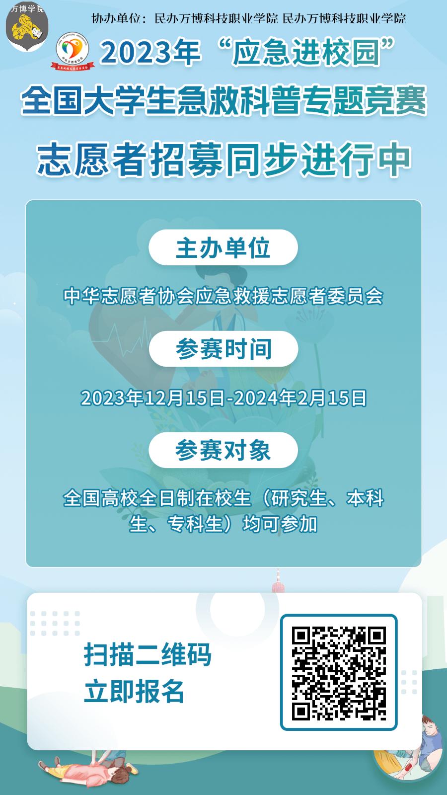 为深入宣传深入贯彻《健康中国2030规划纲要》相关要求,加强公众安全教育,增强风险防范意识,提升应对突发事件的能力,和提高全国大学生的应急救援能力👩🏼🎨🦣,增强校园安全意识,推动应急救援事业在高校的普及和发展。为此中华志愿者协会应急救援志愿者委员会发起主办2023 年“应急进校园”全国大学生急救科普专题竞赛👚。本次竞赛旨在通过线上知识竞答的方式,引导大学生重视应急救援知识🌕,提升应对突发情况的能力🕶。现决定组织开展2023“应急进校园”全国大学生急救科普专题竞赛,现将有关事项通知如下🫱🏽: