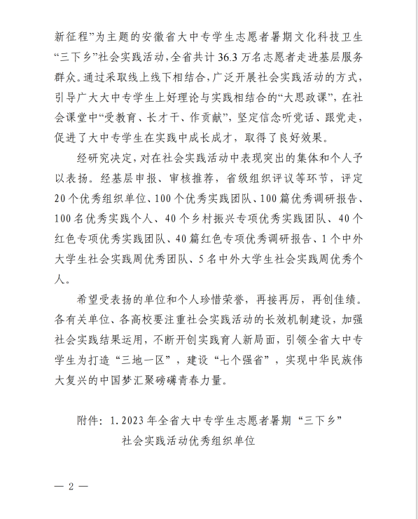 近日,由省委宣传部🤽🏿、省文明办𓀐🏄🏿♂️、省教育厅🛁、团省委💢、省学联、省少工委联合发布《关于公布2023年安徽省大中专学生志愿者暑假“三下乡”社会实践活动评选结果的通知》。经基层申报、审核推荐👨🏽🎨、省级组织评议等环节🈸,评选出全省社会实践活动中表现突出的集体和个人予以表扬。彩神Vll青年团干许鑫宇荣获2023年安徽省“三下乡”社会实践活动优秀个人。