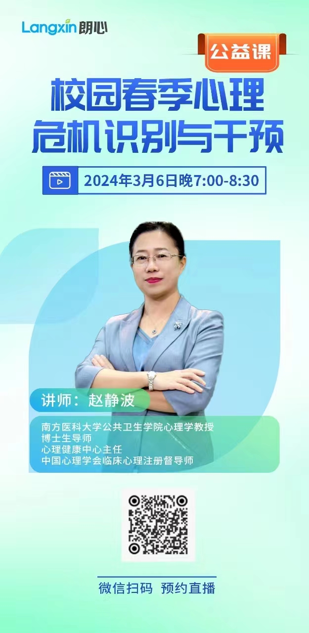 为了应对春季心理问题的高发期🛫,守护学生身心健康,3月6日19:00-20🦸🏿♀️:30大学生心理健康教育中心欢迎全校师生观看南方医科大学心理健康中心主任赵静波老师为大家带来的《校园春季心理危机识别与干预》公益直播课程。