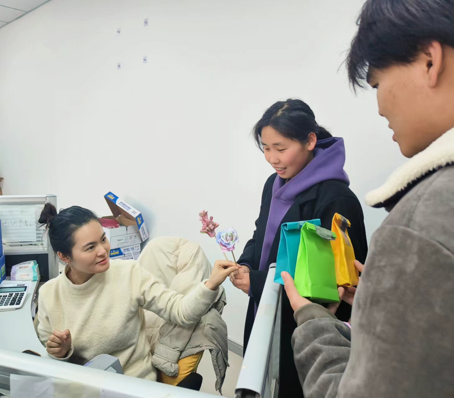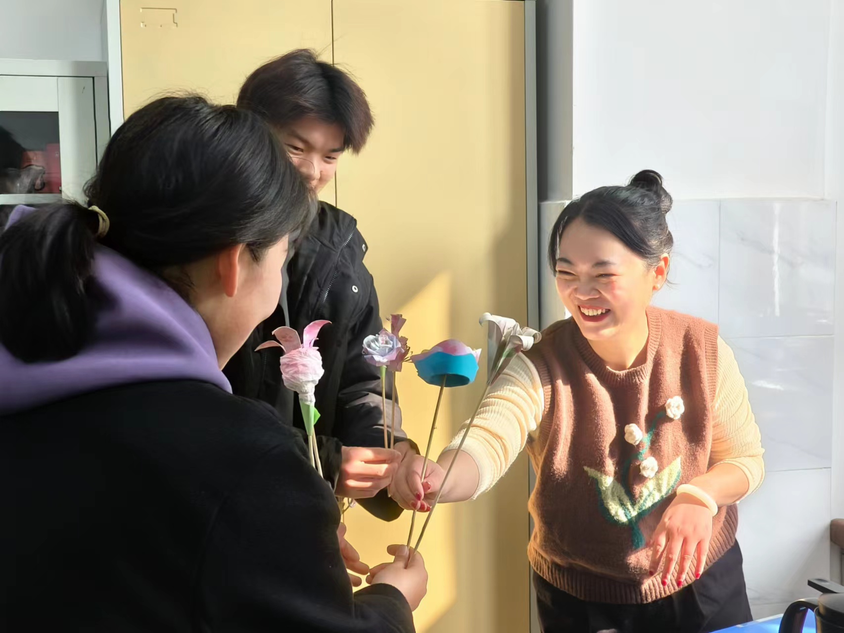 活动中,同学们精心设计了美丽别致的手工艺品。他们用餐巾纸做成的纸巾玫瑰和折纸百合含苞待放,用卡纸制成的精美礼袋🏨,里面装着充满惊喜的“糖果盲盒”。礼物虽轻,胜在心意。办公室👨🎤、宿管休息室🚯😶、讲台上……学生们把一枝枝美丽的花朵和一个个充满祝福的礼袋送到女老师们手中,感谢她们为学校的发展贡献了智慧和力量,她们无不惊喜又感动,幸福的暖流弥漫在整个校园。